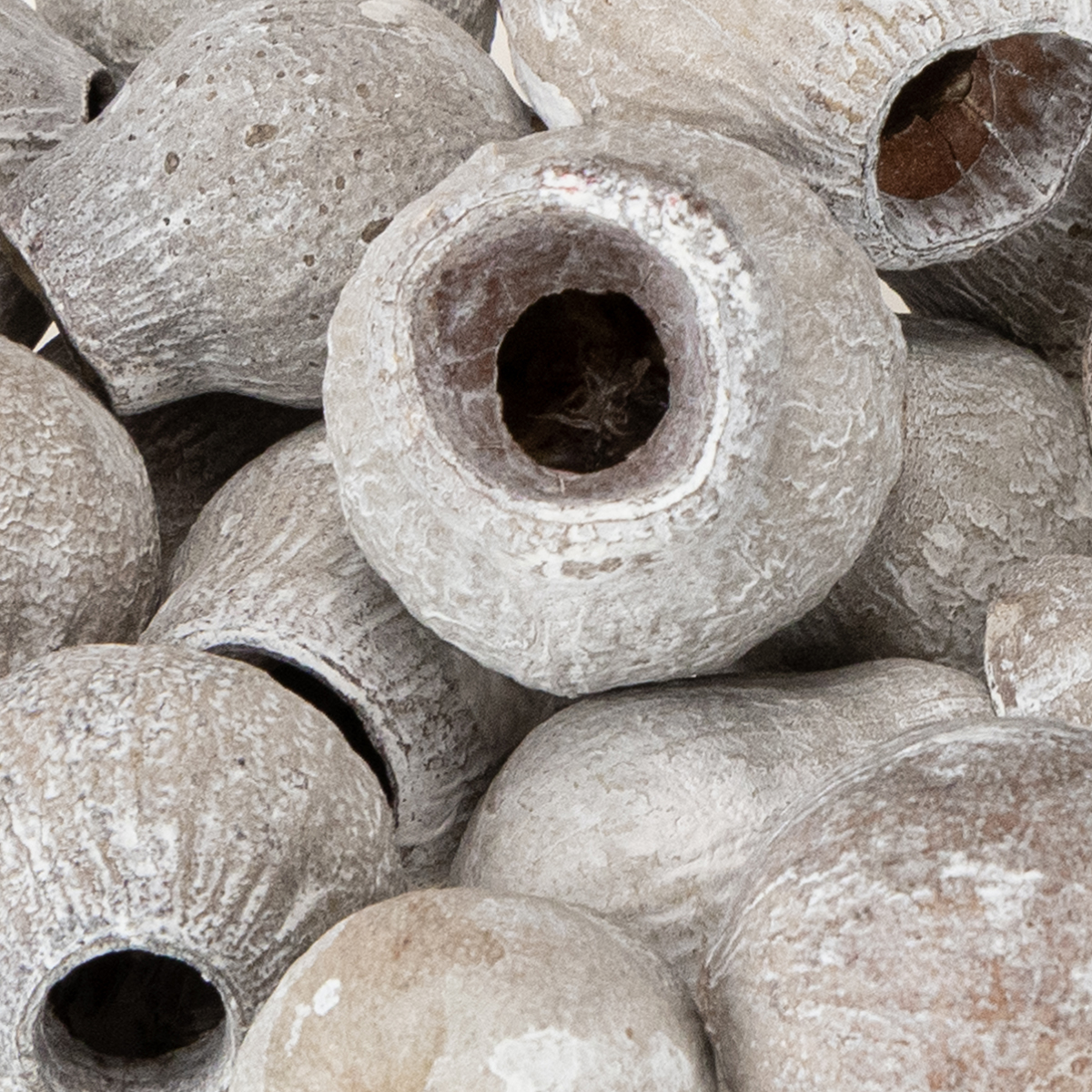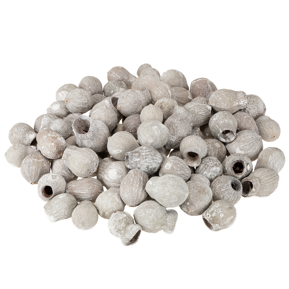 Erikoiset luonnontuotteet tunnetaan myös nimellä bell fruit, koska ne muistuttavat pieniä kelloja, joiden alaosa on ilmapallomainen ja ylhäältä kapeampi. Voimakkaasti puiset hedelmät valmistettiin huolellisesti ja koverrettiin ytimeen asti. Valkoinen pesu antaa niille tyylikkään, talvisen ilmeen, mikä tekee niistä ihanteellisia komponentteja siroille hautajaiskukka-asetelmille.