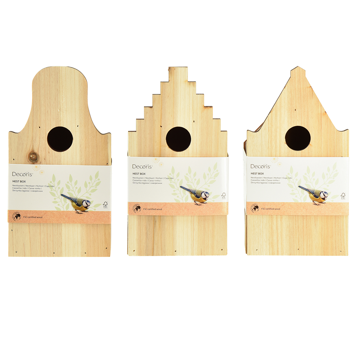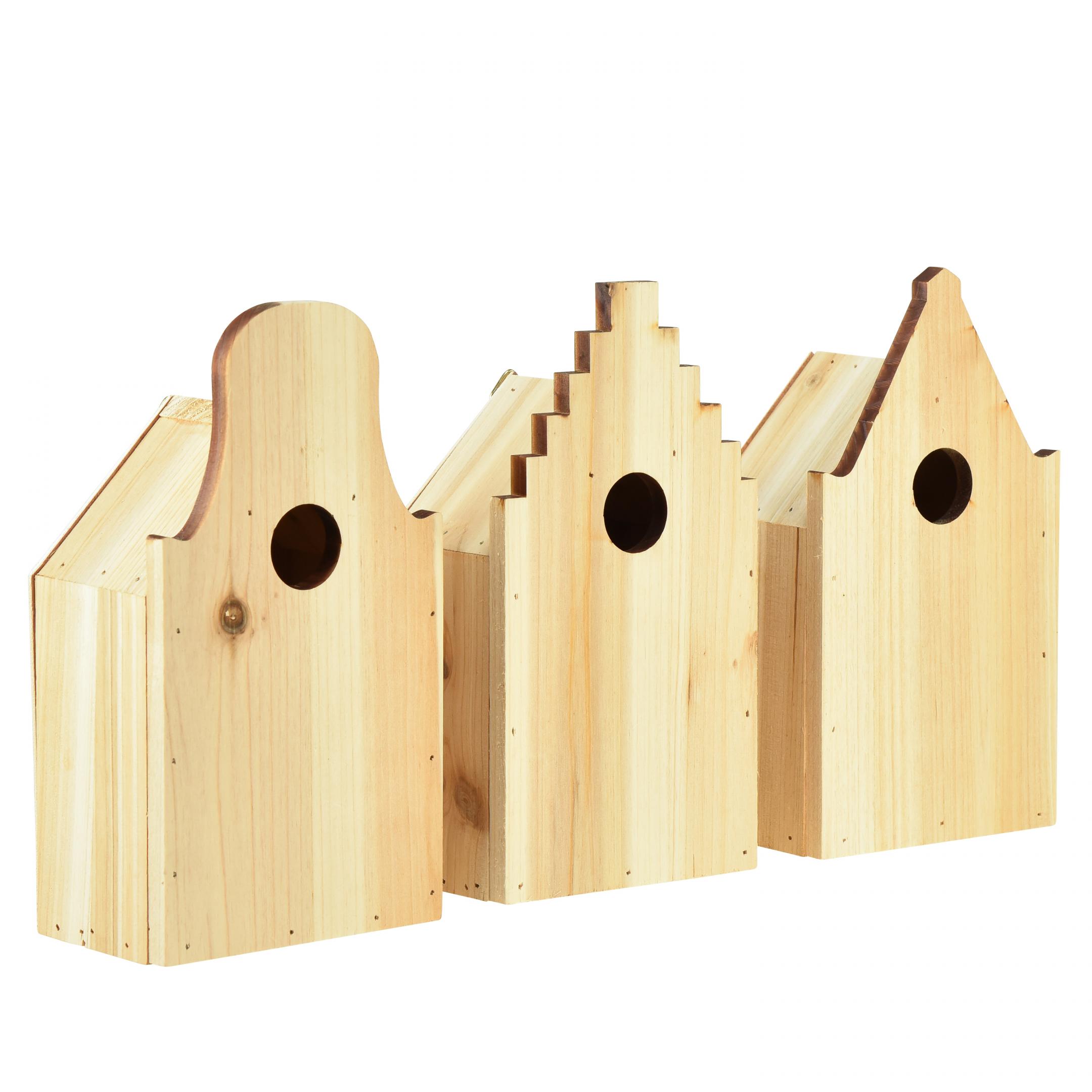 Saat puisen lintumajan 3 kappaleen pakkauksissa. Perusmitat ovat samat. Hautomot voidaan erottaa houkuttelevista erilaisista julkisivuistaan.