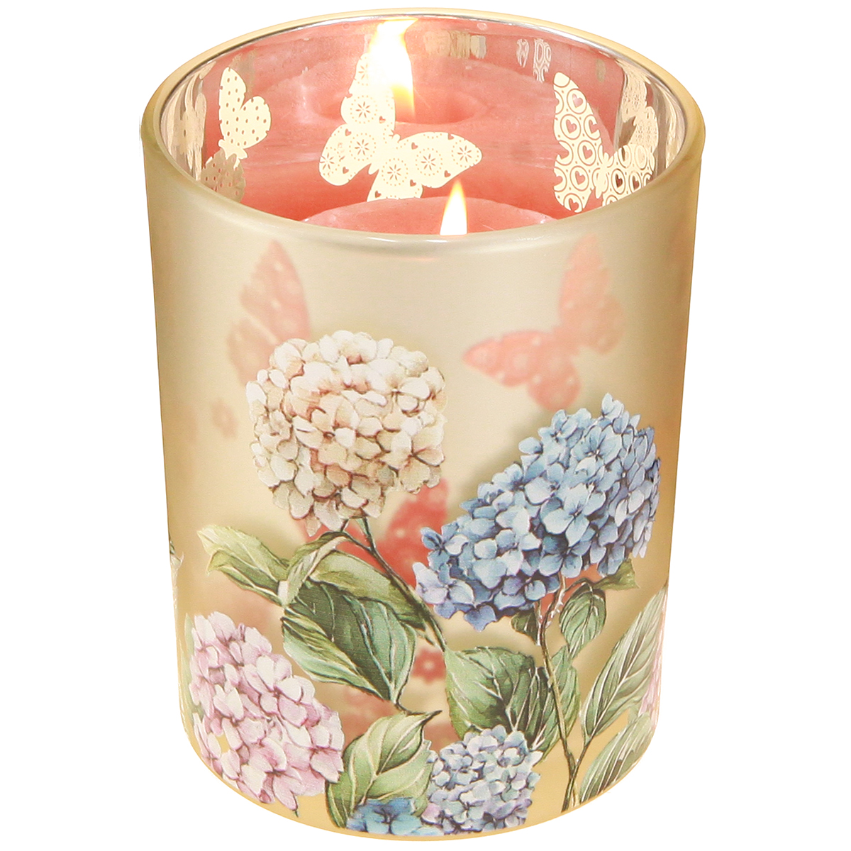 - Kukkaislyhty, jossa on herkkä hortensia-aihe