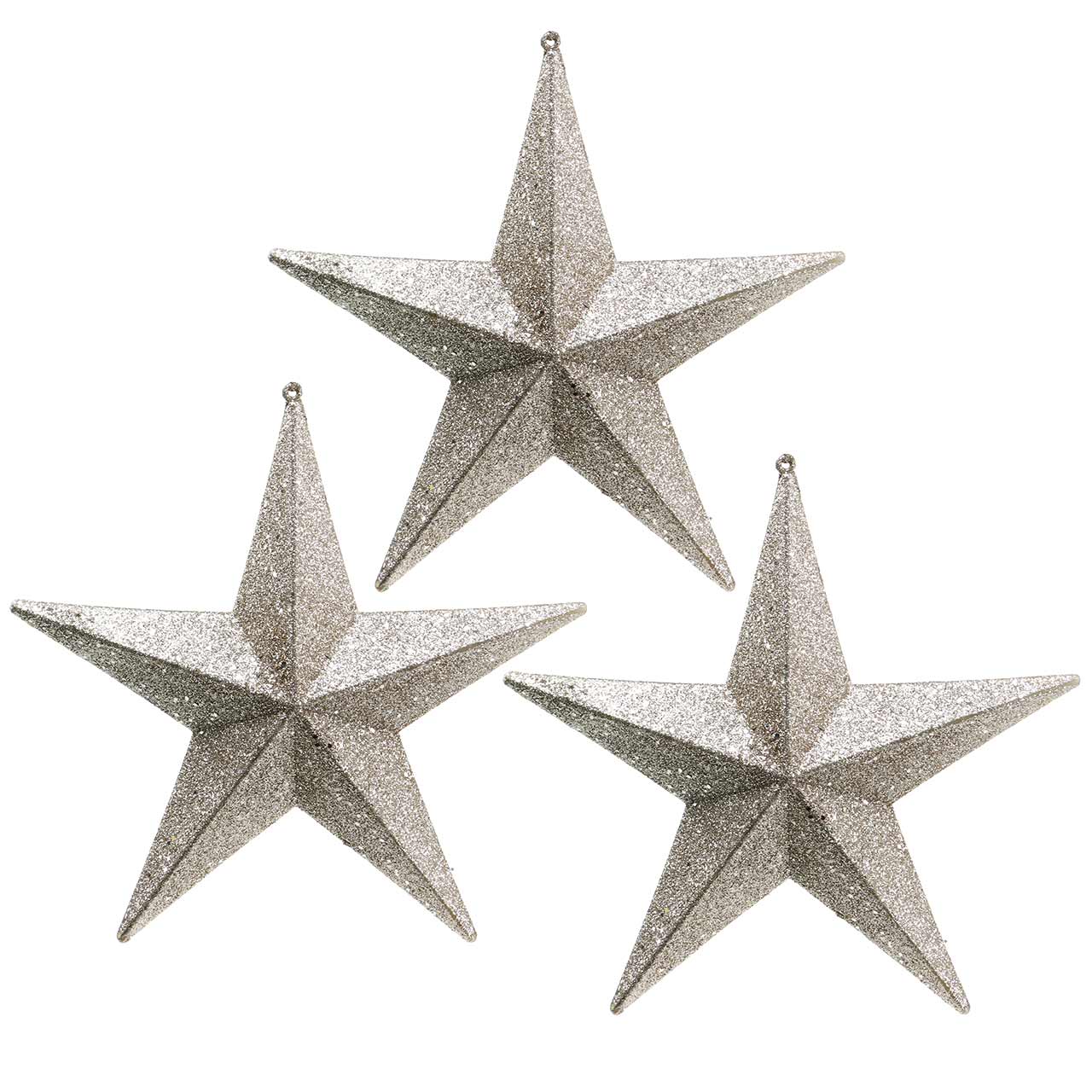 Vaat kimaltelevat koristetähdet koristeeksi VIANA:n 3 kappaleen setissä. Tähtiriipusten halkaisija on noin 21 senttimetriä. Jokaisessa tähdessä on pieni silmukka ja se on jo varustettu hopeisella nauhalla ripustamista varten. Nauhalla ripustettavan glittertähden kokonaispituus on noin 27 senttimetriä.