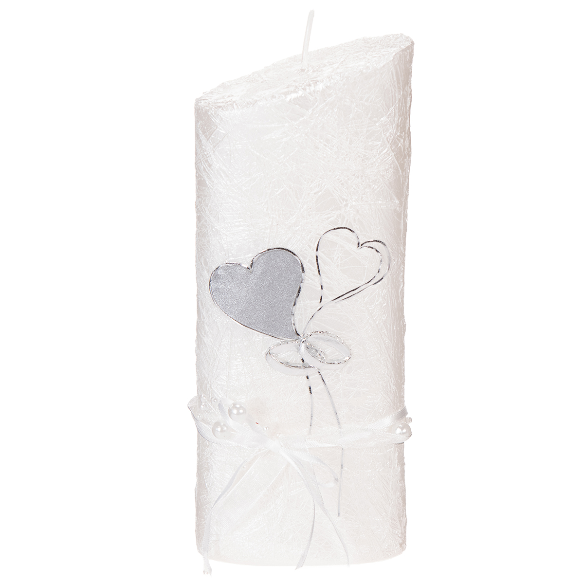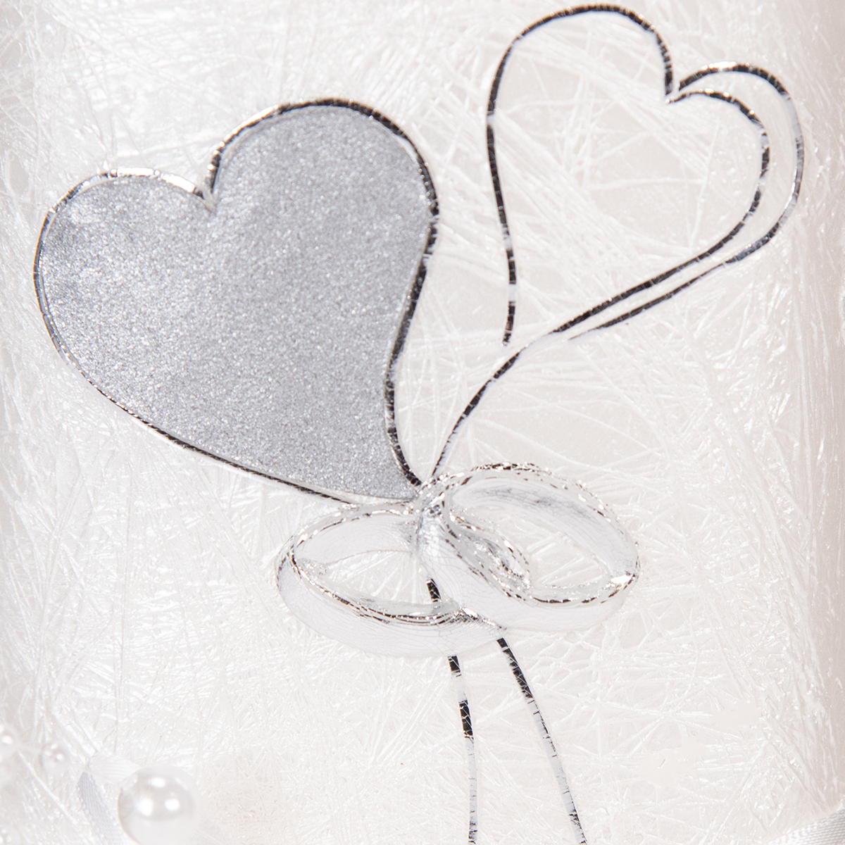 Tämä elegantisti hohtava valkoinen hääkynttilä täydentää täydellisesti pöytäkoristeitasi! Koska renkaiden ja sydämien muotoilu on hopeinen, tämä kynttilä sopii erinomaisesti myös hopeisiin hääpäiviin.