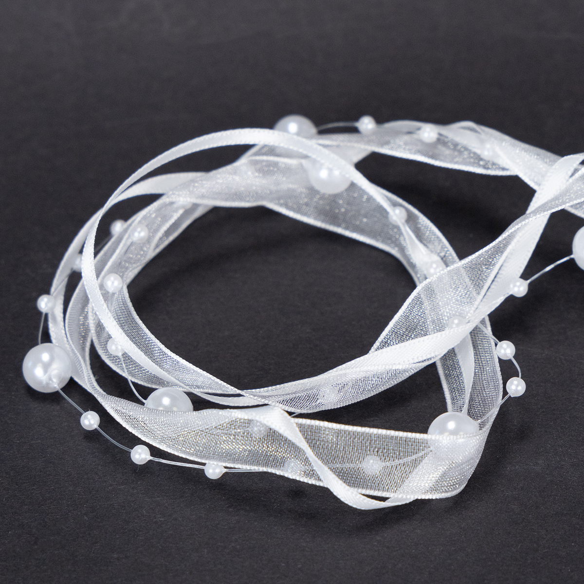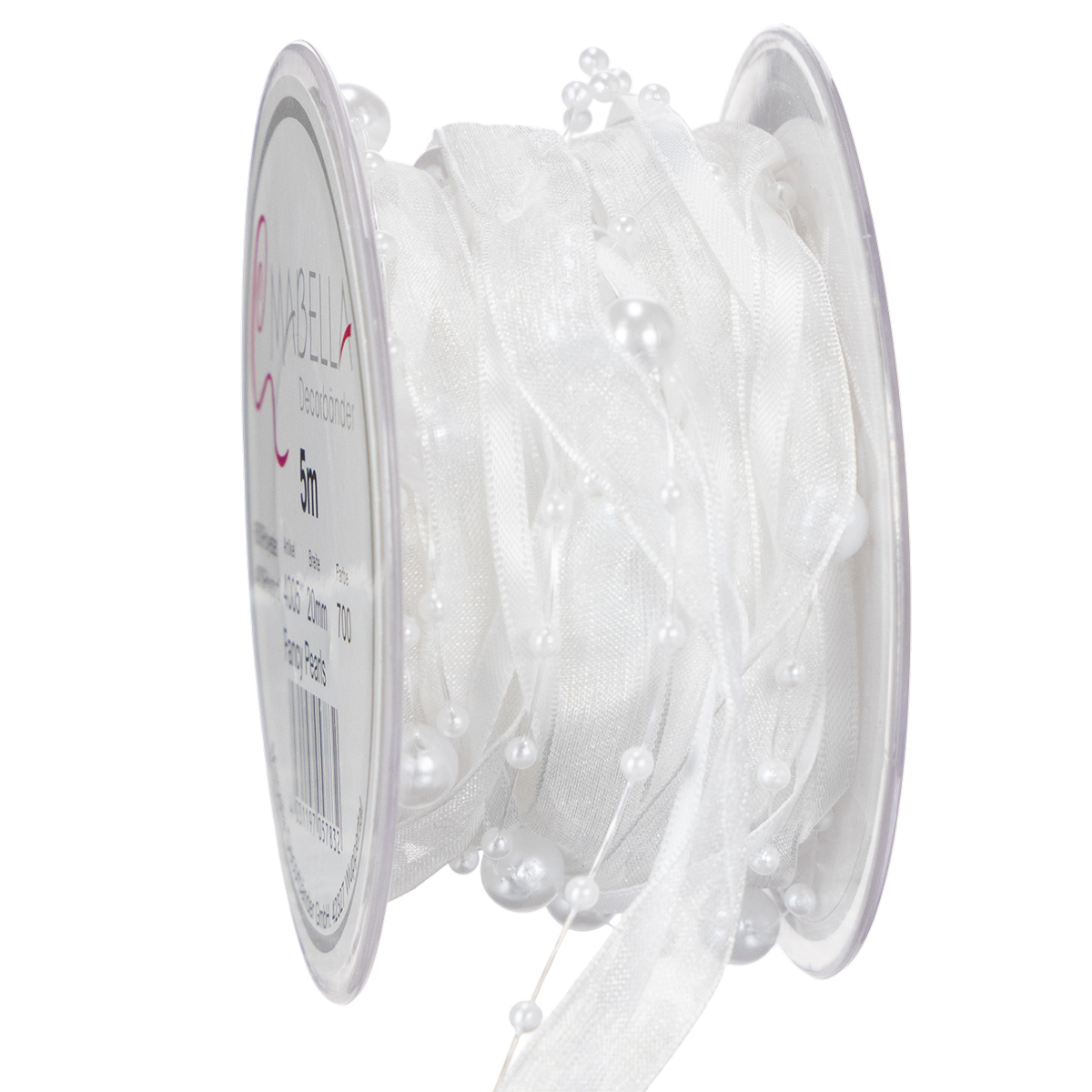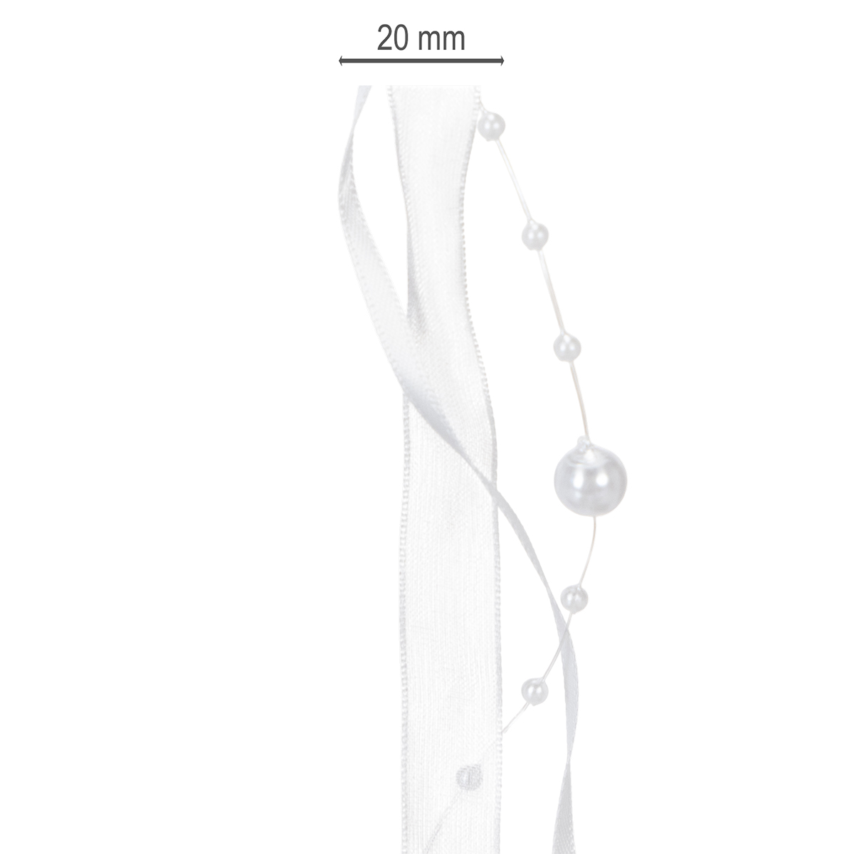 Valkoinen häänauha on noin 5 metriä pitkä ja se on kääritty muovirullalle. Leveys on noin 20 millimetriä ja helmien halkaisija on noin 0,2-0,8 senttimetriä.