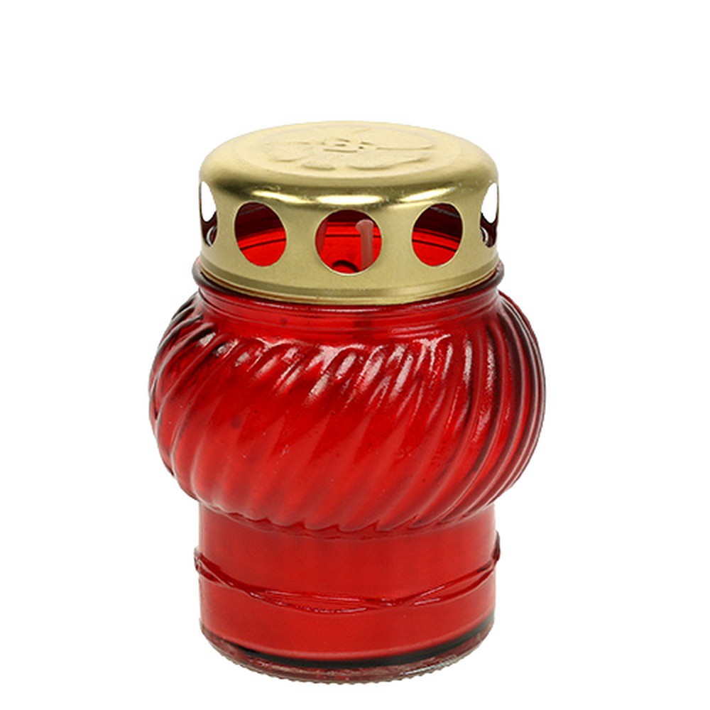 Pyöristä haudan muotoilu tyylikkäästi tällä hautavalaisimella, joka on kauniissa punaisessa lasipallossa! Valkoinen pilarikynttilä on sipulimaisessa lasissa, jossa on kätevä urakuvio, ja se suljetaan metallista tehdyllä kultaisella kannella. Metallinen kansi suojaa liekkiä tuulelta ja sateelta, kun se on vielä koristeltu kukkakuvioinnilla yläosassa ja varustettu rei'illä sivussa.