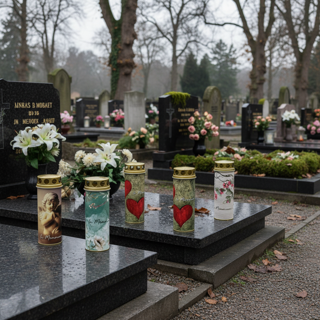 Voit asettaa painetut hautakynttilät suoraan haudalle tunnelmavalaistuksena tai sijoittaa ne läpinäkyvään lyhtiin. Hautavalo on erityisen tehokas silloin, kun se on täysin näkyvissä ja vastaava aihe harmonisoituu ympäristöön.