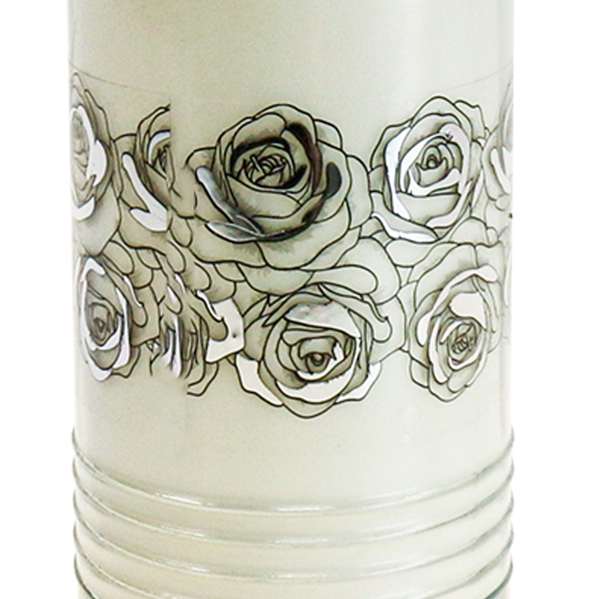 Valkoiset hautakynttilät on koristeltu kauniisti hopeisella ruusureunuksella. Kansi suojaa hautakynttilää kosteudelta ja sateelta.