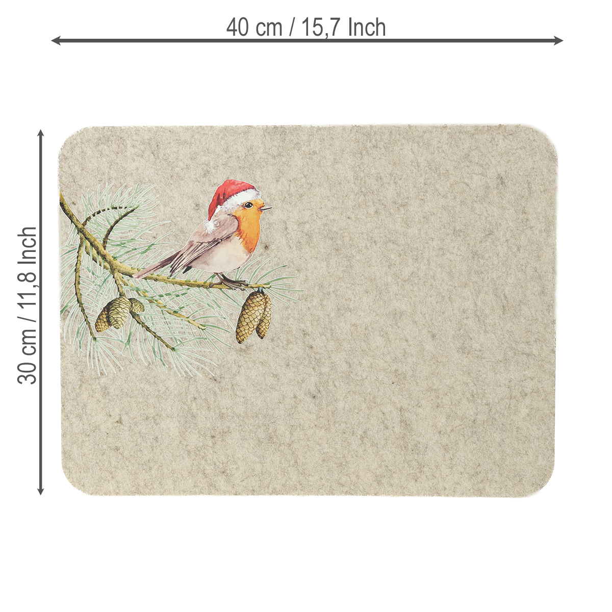 Tämä pöytäliina on täydellinen valinta kaikille, jotka haluavat luoda viihtyisän mutta elegantin tunnelman. Korkealaatuisesta beigenharmaasta huovasta valmistettu lasinalus tuntuu miellyttävältä ja sillä on yksinkertainen tyylikkyys, joka täydentää täydellisesti joulukoristeita. Pienen punarinnan kuvio, jolla on joulupukin hattu ja joka istuu männynoksalla, on erityisen ihastuttava. Tämä leikkisä mutta tyylikäs aihe tuo iloa kattaukseen olematta kuitenkaan liian häiritsevä. Kääntöpuoli on painamaton, joten voit käyttää alustaa yksinkertaisesti toinen puoli ylöspäin – monipuolinen eleganssi yhdessä setissä!