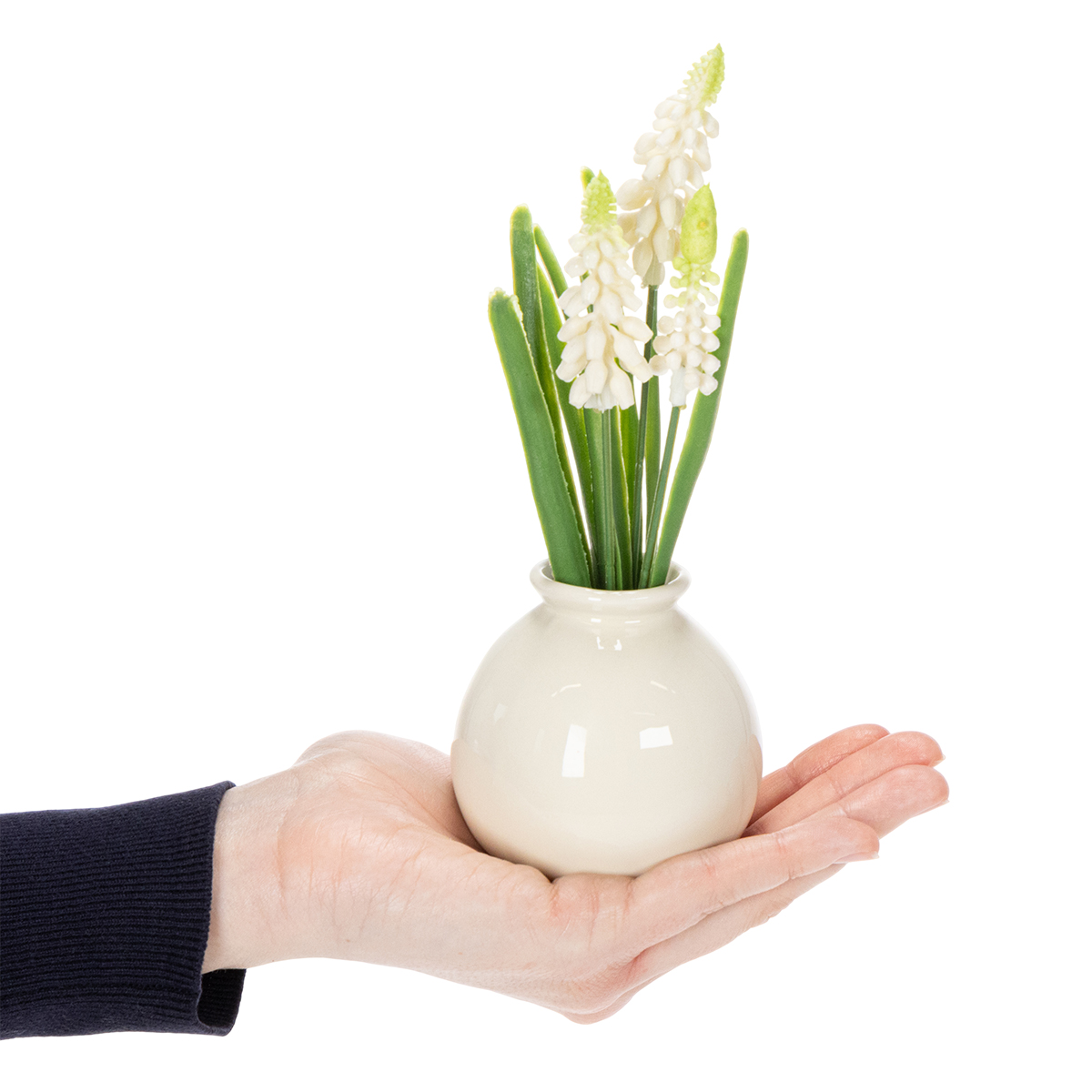 - Väri: Herkät valkoiset kukat, kermanvalkoinen maljakko
