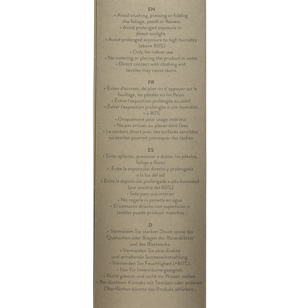 Jalo Amorosa yhdistää luonnon parhaat puolet ja käsityötaitoa. Jokainen ruusu on huolellisesti valittu ja säilytetty erityisellä prosessilla, joka säilyttää sen luonnollisen kauneuden. Punaiset kukat säteilevät elinvoimaa, kun taas lehdet ovat syvän, täyteläisen vihreitä luoden harmonisen värileikin. Tämä noin 54 senttimetrin pituinen punainen säilynyt ruusu tarjoaa lukemattomia suunnittelumahdollisuuksia ylellisiin kodin sisustuksiin tai vaikuttaviin pöytäasetelmiin.