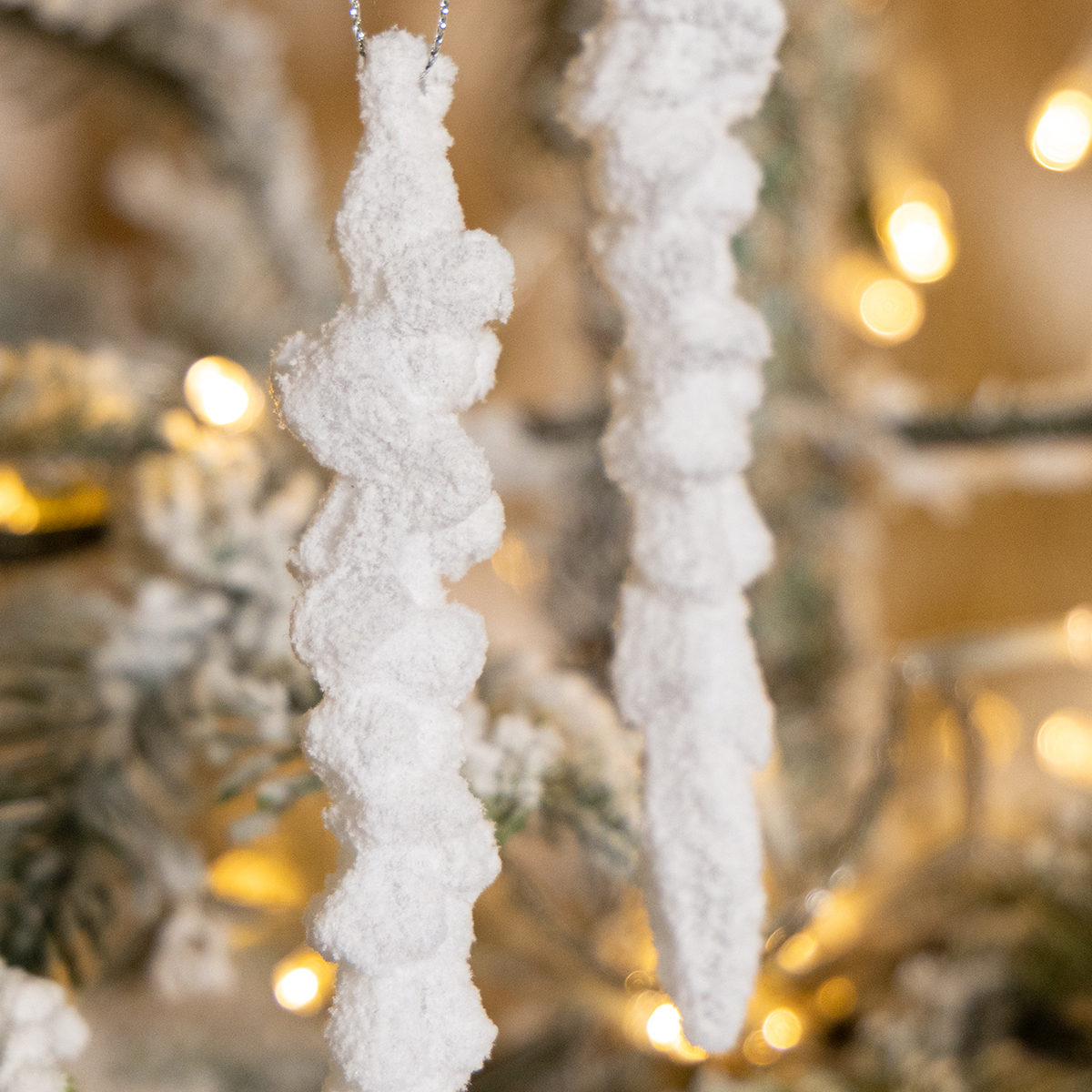 Jääpuikkojen muotoiset lumipeitteiset joulukuusenkoristeet – valkoista talven taikaa olohuoneeseen