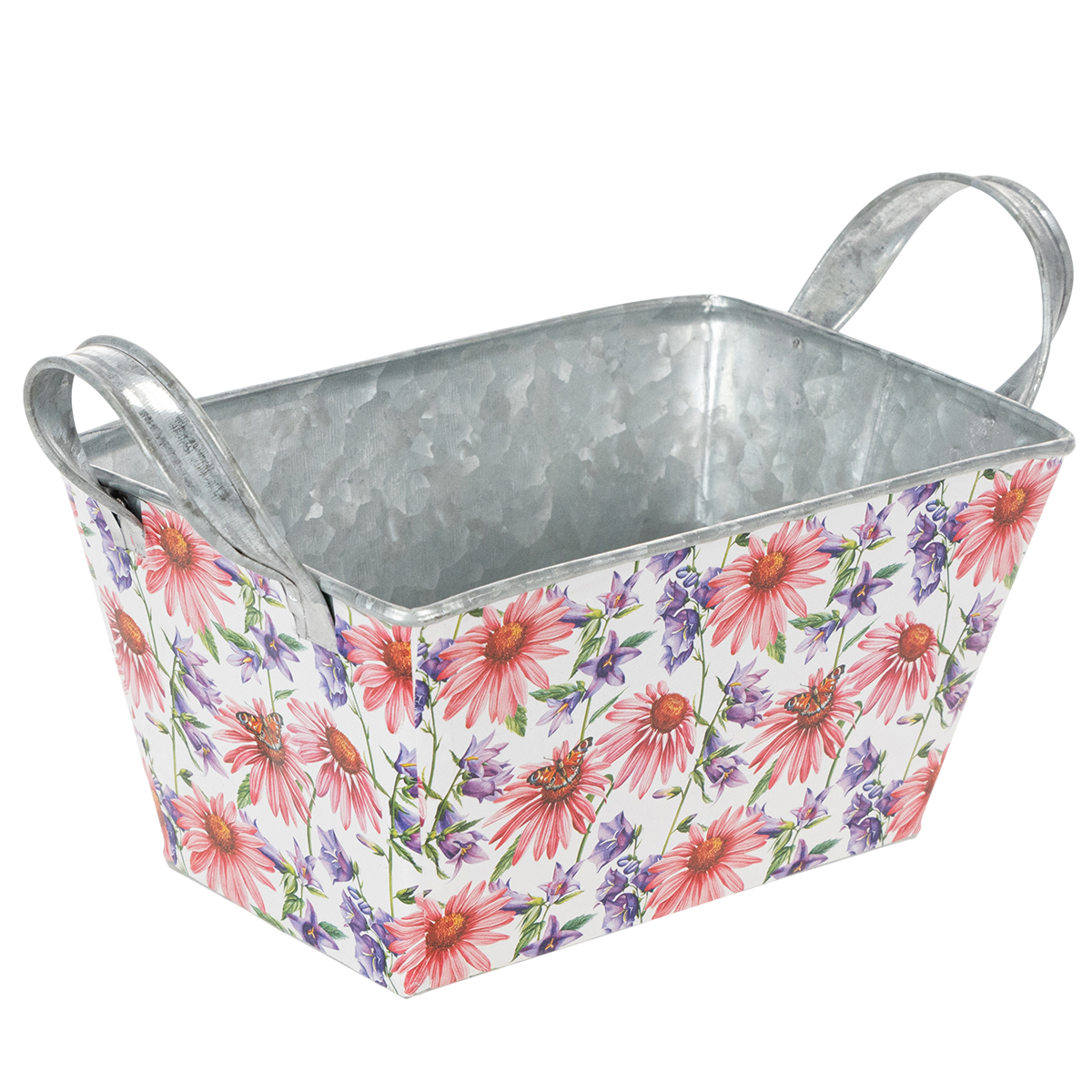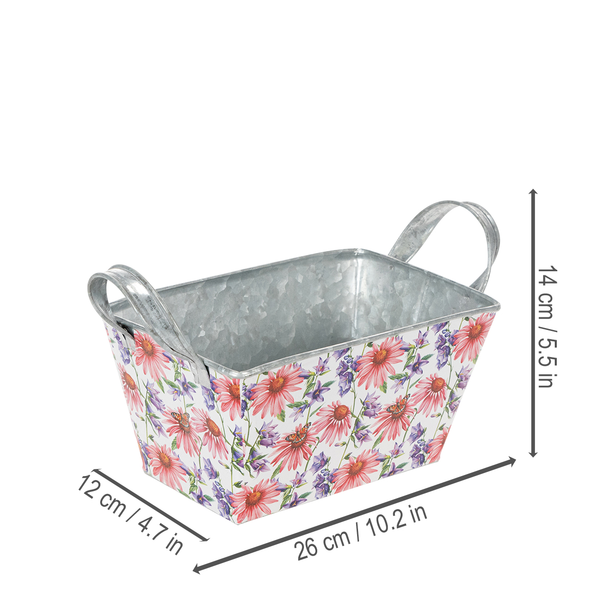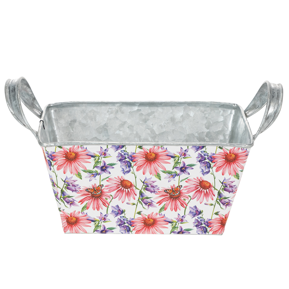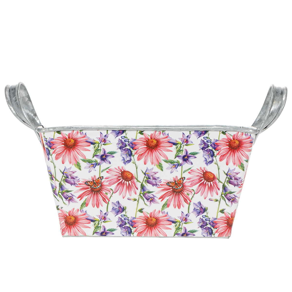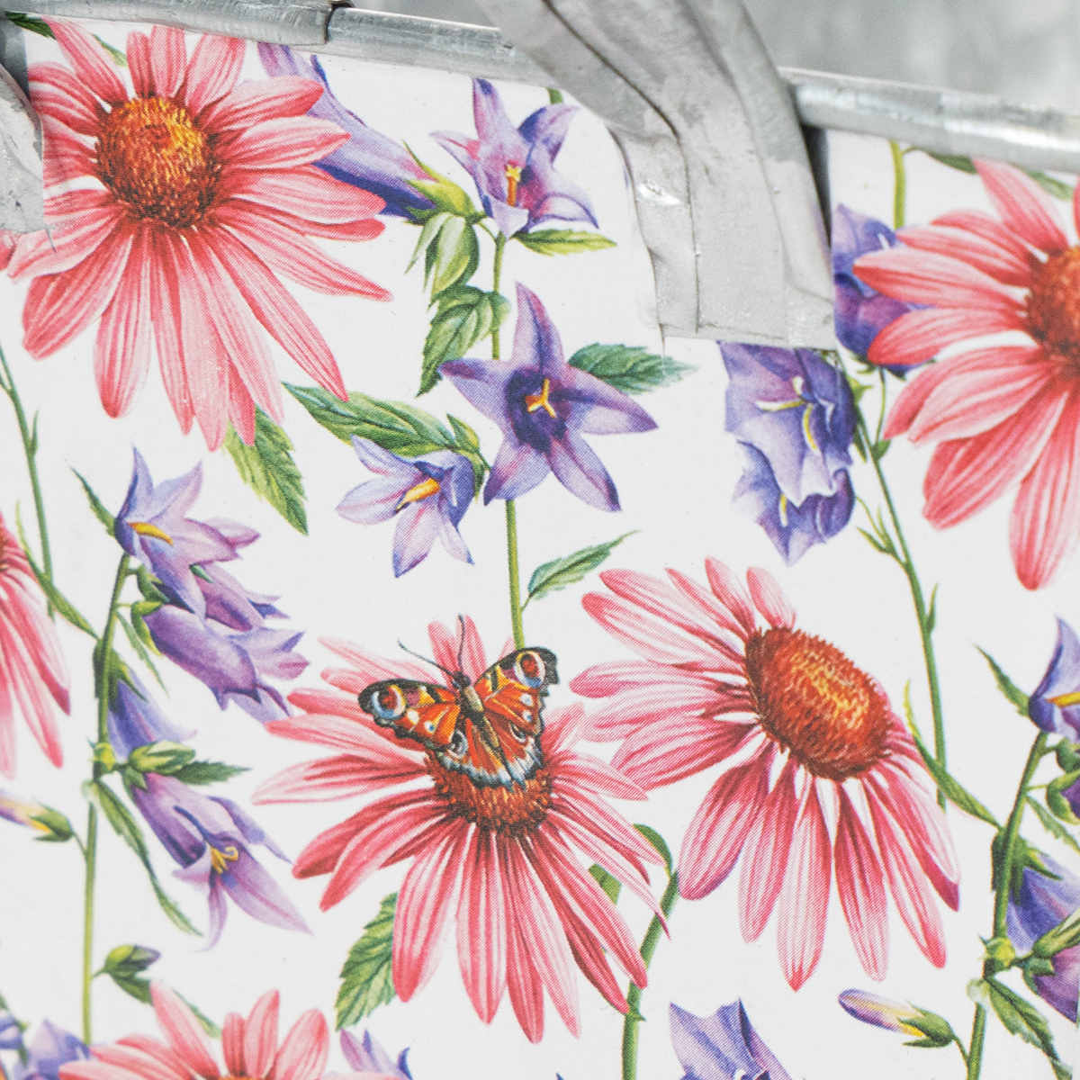 Vaaleanpunaiset ja lilat kevätkukat valkoisella pohjalla luovat monipuolisen ja optimistisen kehyksen. Kukkamotiivi on painettu tukevalle kalvolle, joka puolestaan tarttuu sinkkiastiaan. Näin hopeanvärinen sinkki sisäpuoli muodostaa vahvan kontrastin kevätkoristeeseen.