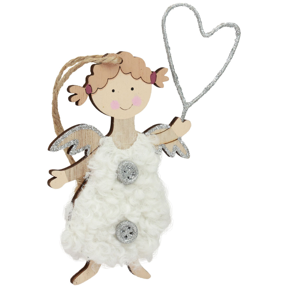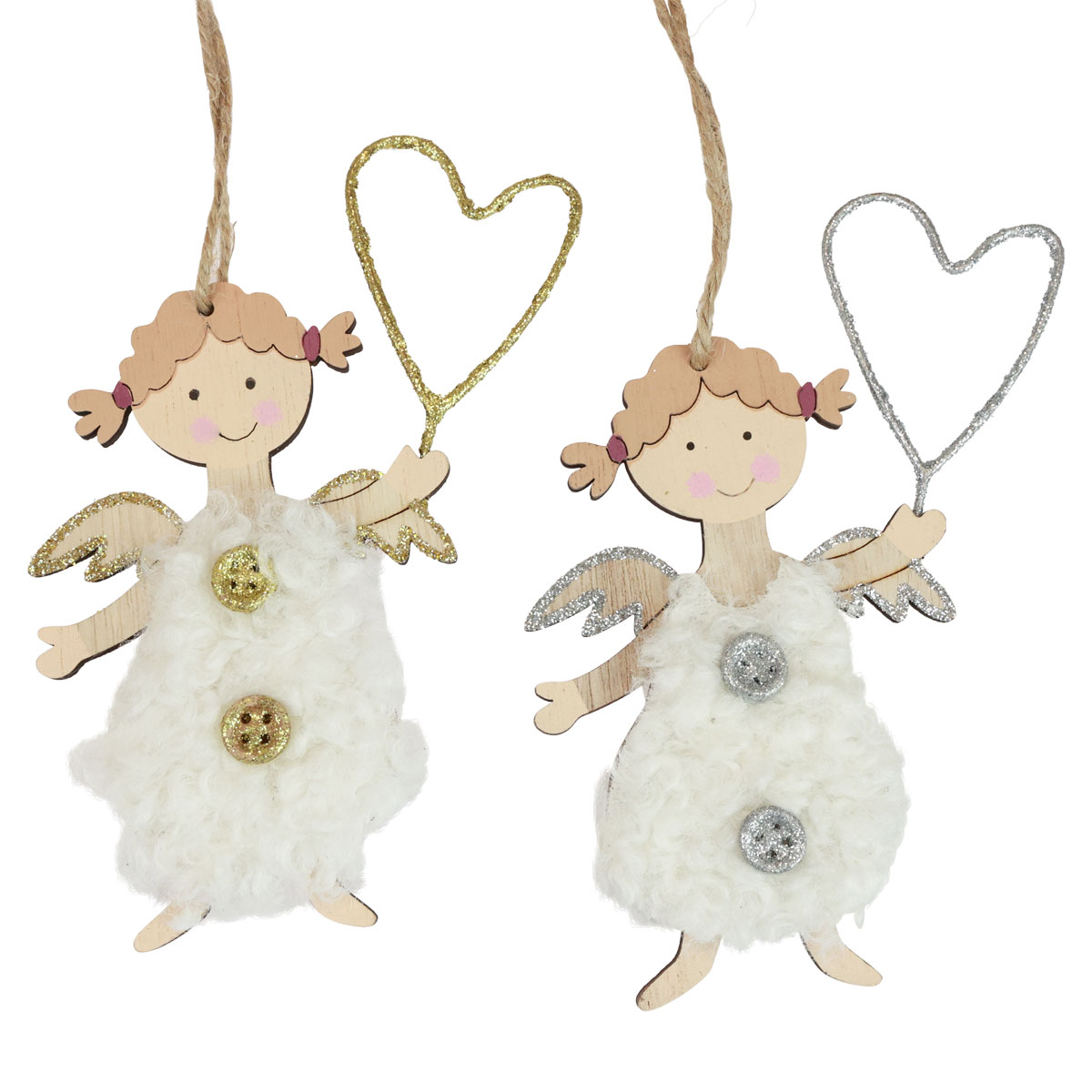 Jokainen enkeliriipus on taidokkaasti käsinmaalattu ja koristeltu rakastavilla yksityiskohdilla. Joulun enkelit hymyilevät juhlakoristeissa villamekosta kimaltelevilla napeilla ja metallilangasta tehtyyn sydämeen. Maalaamaton puinen selkäosa ja juuttinyöri näyttävät joulukuusenkoristeet maalaismaisesta puoleltaan.
