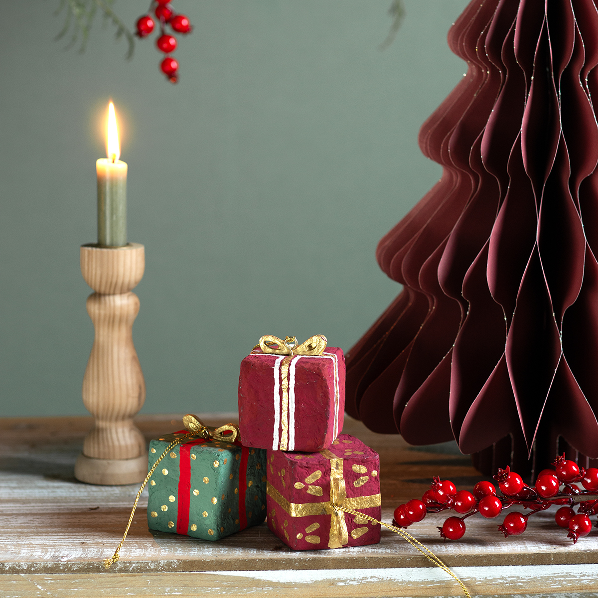 Lahjapaketit joulukoristeena: paperimassasta tehdyt puukoristeet