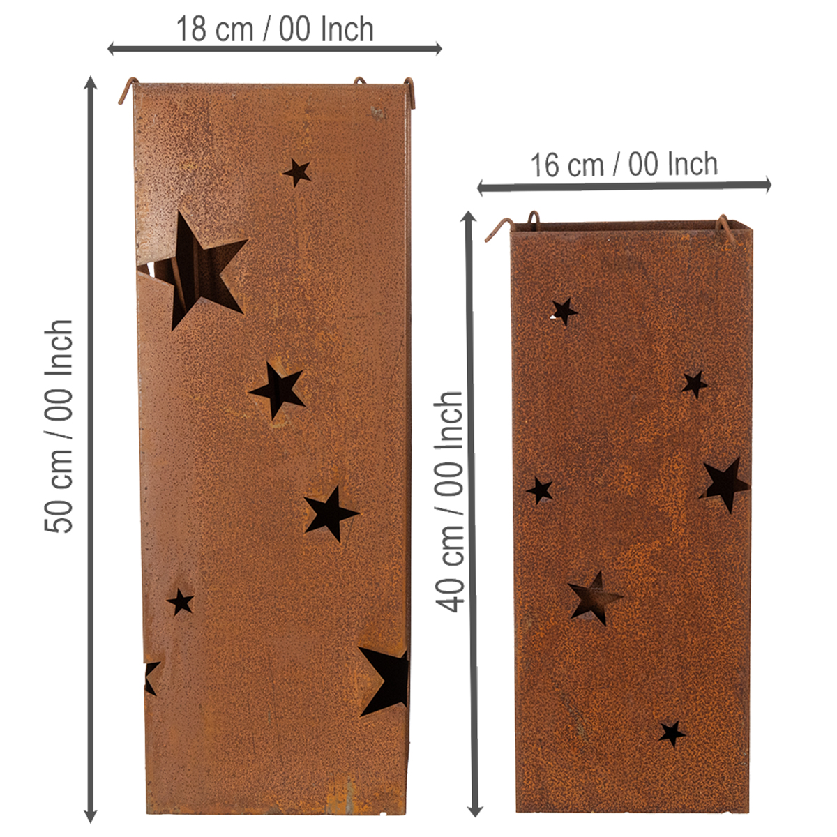 Näitä kynttilänjalkoja on saatavana kahden kappaleen setissä, joiden korkeus on 50 senttimetriä ja 40 senttimetriä. Saat parvekkeesi tai terassisi loistamaan patinakoristeen tähdistä.