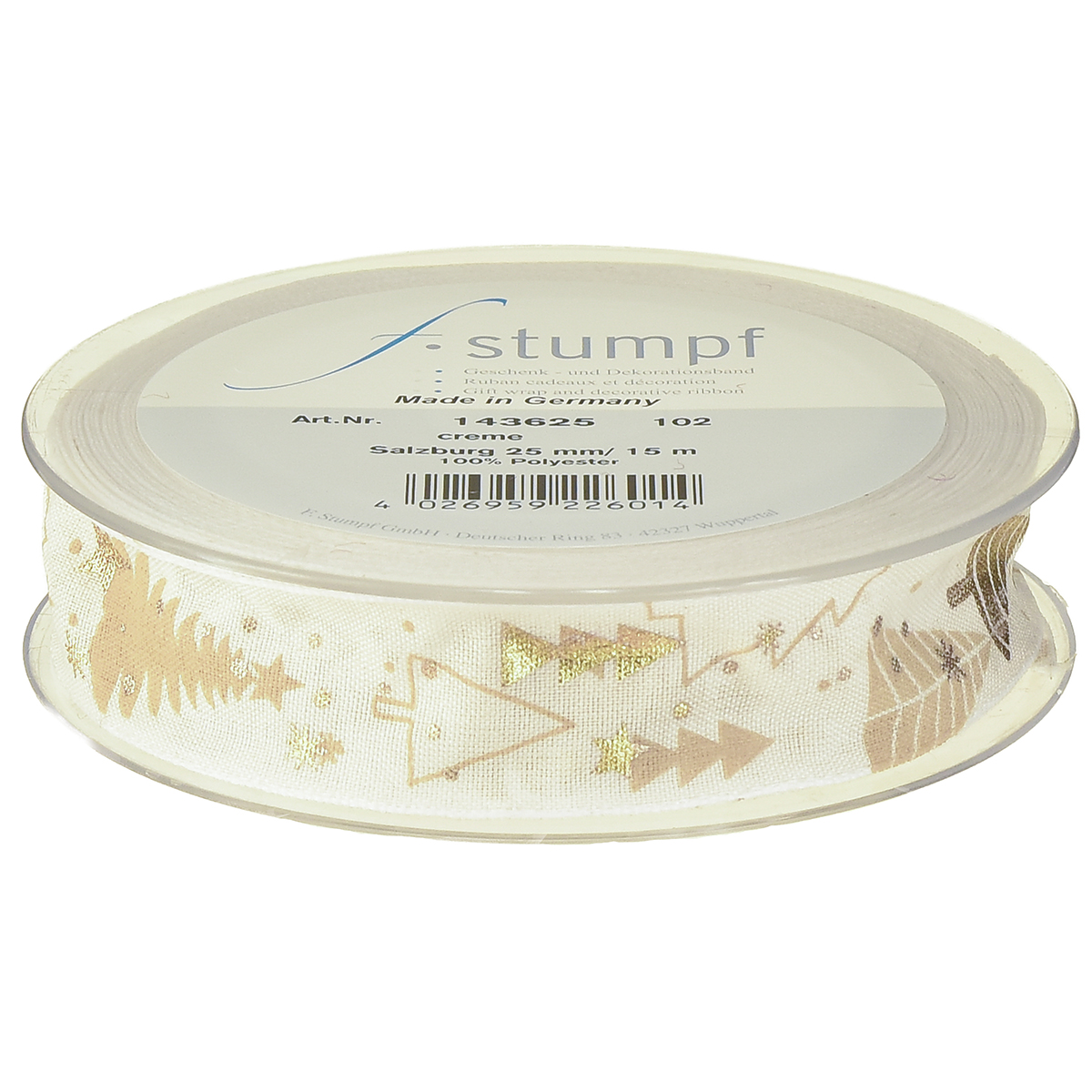 Kermanvärinen joulunauha, jossa on vahvistettu reunus ja kultaiset yksityiskohdat, on noin 15 metriä pitkä ja noin 25 millimetriä leveä. Se toimitetaan käytännöllisessä muovirullassa.Integroidun ja muovilangalla vahvistetun reunuksen ansiosta voit helposti sitoa muotonsa säilyttäviä rusetteja ja kiinnittää niitä töihisi ja lahjoihisi. Tämä joulunauha sopii erinomaisesti sekä koriste- että kangaslahjapakkauksiin.