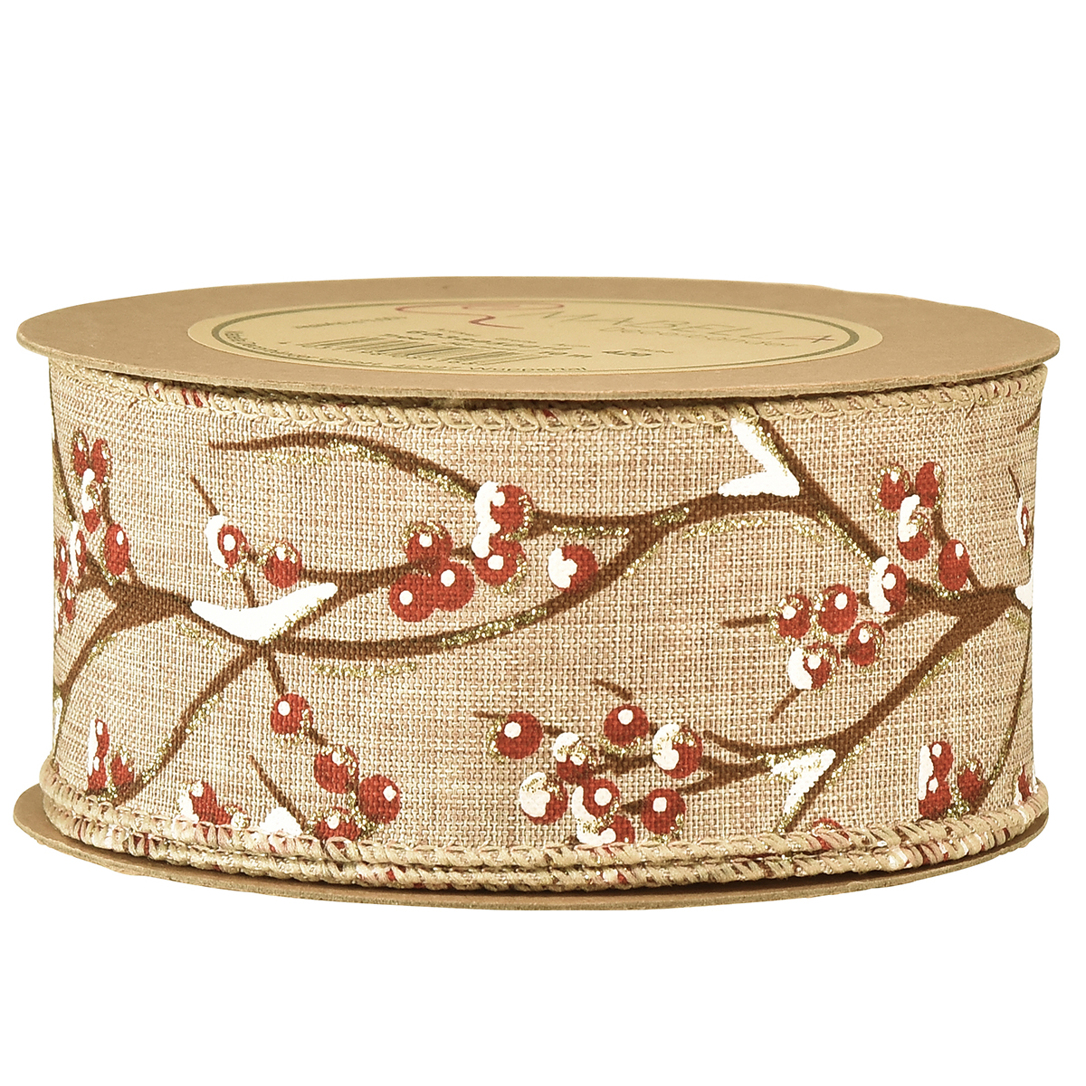 Koe talven taika ruskealla joulunauhallamme punaisilla pihlajamarjoilla. Pellavanäköinen nauha huokuu juhlallista charmia ja rikastuttaa kaikkia joulukoristeita.