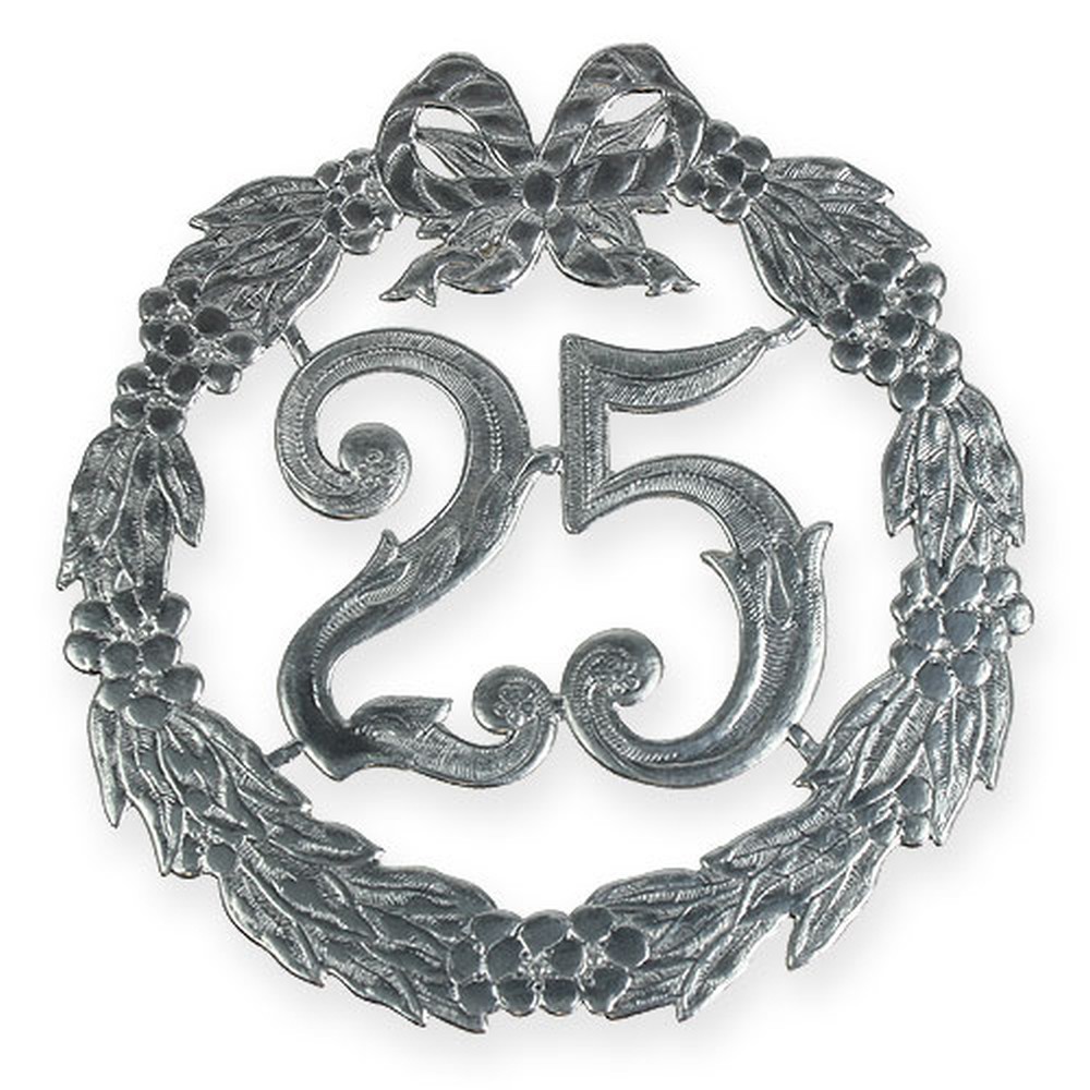 Hopealla oleva vuosipäivänumero "25" on halkaisijaltaan noin 24 senttimetriä ja sopii myös kuusiseppeleen koristeeksi. Kiinnitä koristenumero yksinkertaisesti liimalla seppeleeseen tai seppeleen pohjaan. Muutamalla yksinkertaisella toimenpiteellä luot ainutlaatuisen pöydänkoristeen, joka sopii myös ampumakilpailuun tai vastaavaan tilaustapahtumaan.