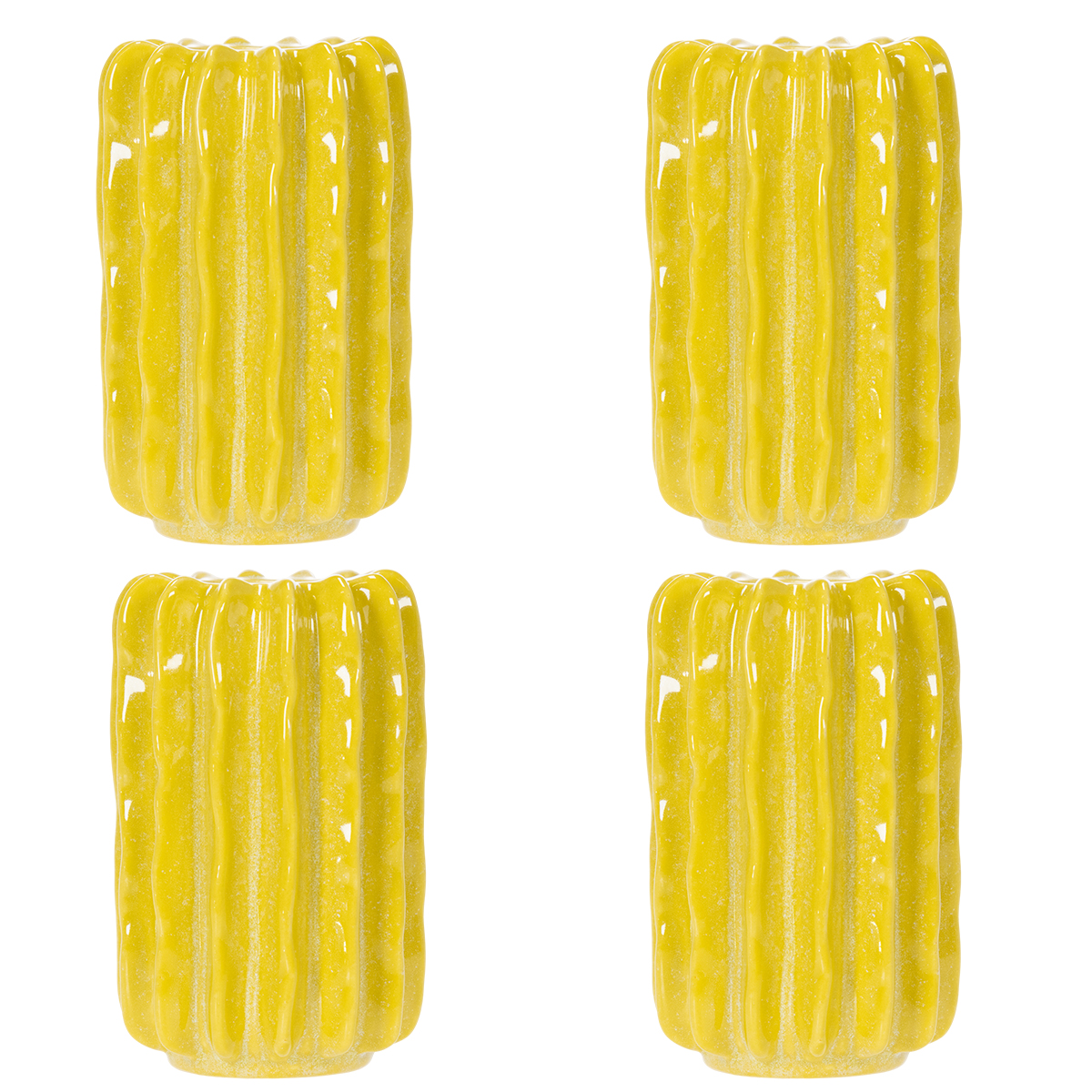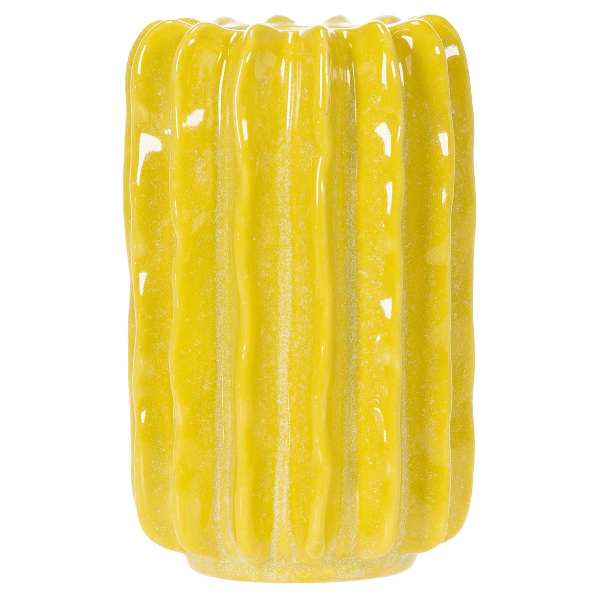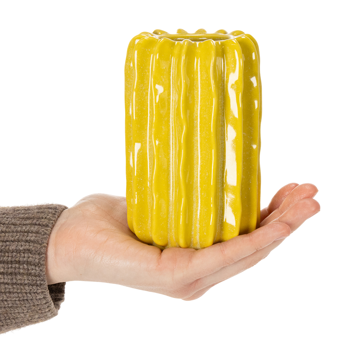 Tämä keltainen, uritettu keraaminen maljakko yhdistää taitavasti muodon ja toiminnallisuuden. 13 cm korkea ja 8 cm halkaisijaltaan oleva maljakko on ihanteellinen valinta pienille huonekasveille, kuten mehikasveille, tai kukka-asetelmille, joissa on kuivattuja kukkia. Tämän mallin eksoottinen tyyli tuo mieleen kesäiset aavikkounelmat ja tekee siitä katseenvangitsijan millä tahansa pöydällä.