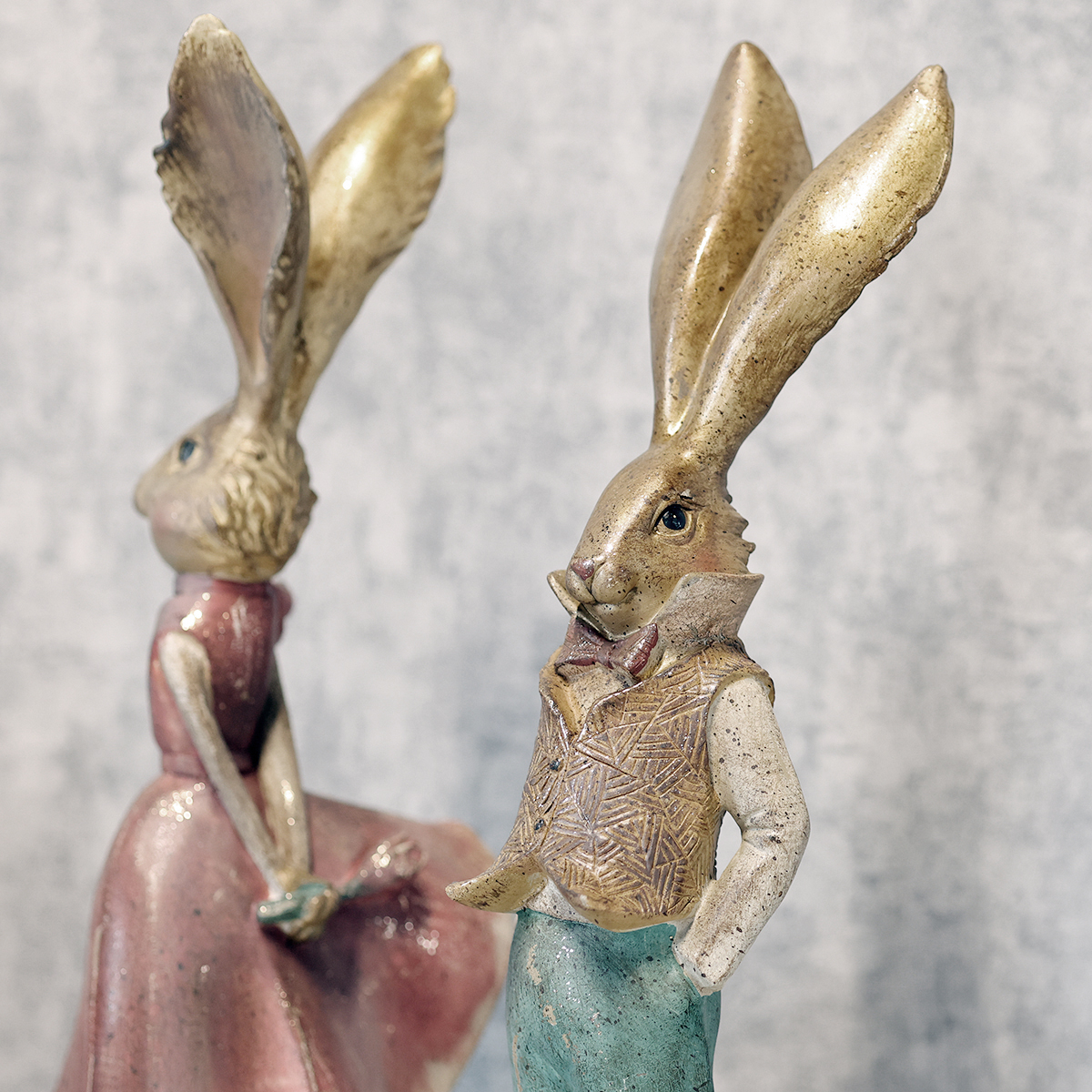 Tämä pupuhahmo tekee vaikutuksen harmonisesti koordinoidulla muotoilullaan. Lämmin ruskea vartalon sävy ja housujen herkän vihreät luovat miellyttävän kontrastin, joka näyttää sekä modernilta että ajattomalta. Erityisesti polystonen kiillotetut yksityiskohdat antavat tälle figuurille eloisan ja aidon ulkonäön. Oletko huomannut, kuinka rakastavasti pienet yksityiskohdat on sijoiteltu? Viehättävästä kasvonilmeestä asun kultaisiin yksityiskohtiin – tässä klassinen pääsiäiskoristeet kohtaavat modernin tyylikkyyden.