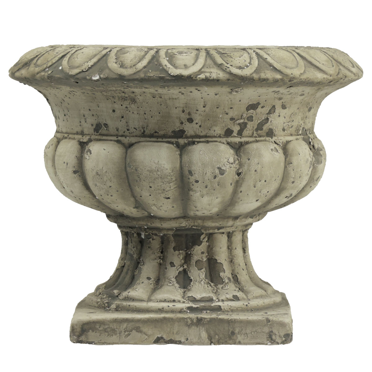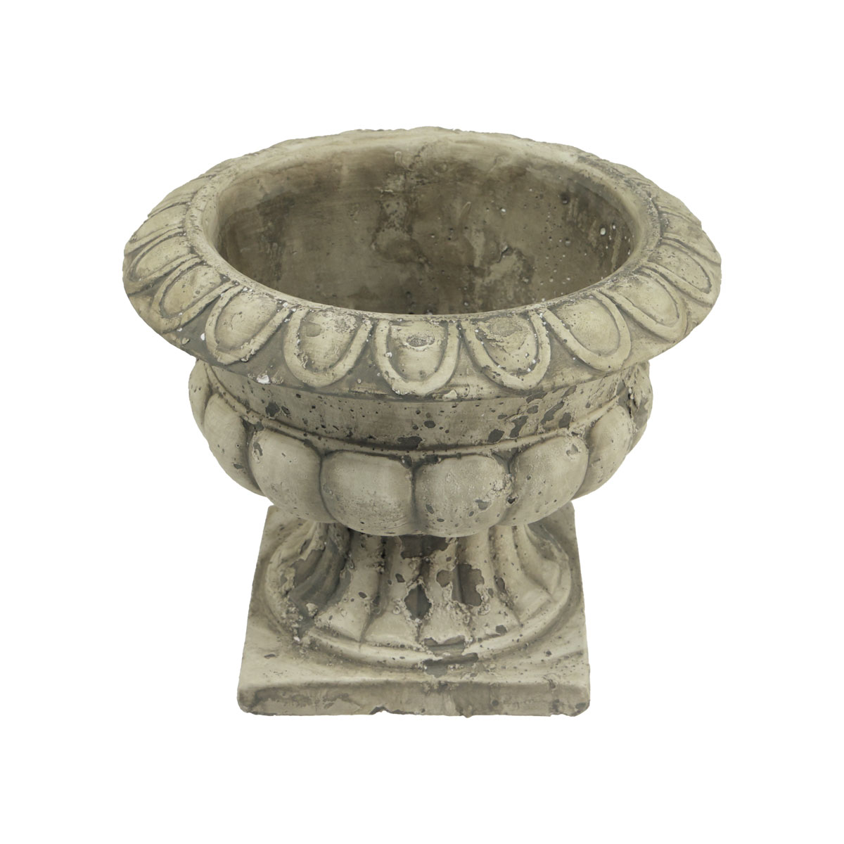 Valkoiset ja tummanharmaat keinotekoiset sään jäljet antavat pieneen kukkaruukuun vertaansa vailla olevaa viehätystä. Tämä on itse asiassa upouusi betonikoristelu! Istutukseen ja koristeluun tarkoitettu antiikkikuppi seisoo tukevasti alustallaan muovisuojilla.