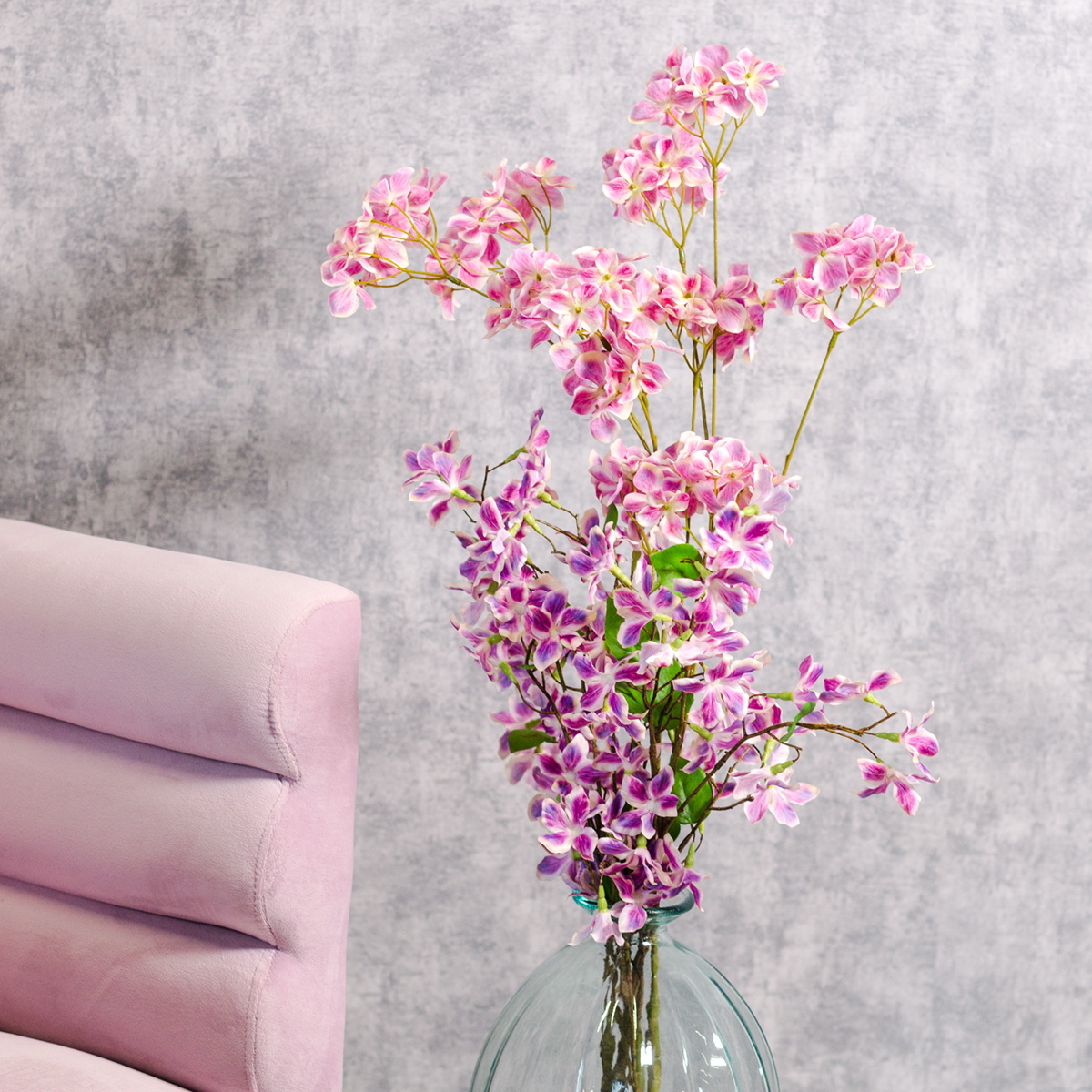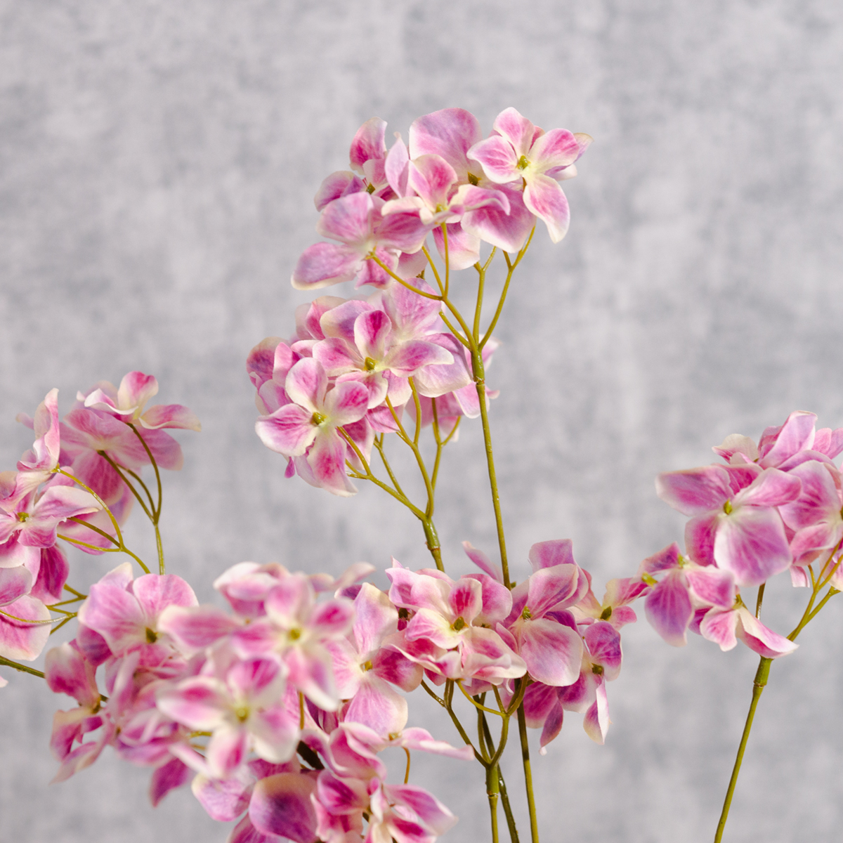 Tämä keinotekoinen hortensia on vaikuttava joka tavalla – sen petollisen realistisesta ulkonäöstä korkealaatuiseen polyesteristä ja muovista valmistettuun rakenteeseen. Jokainen kukinto näyttää niin aidolta, että voit melkein haistaa oikeiden kukkien tuoksun. 110 cm pitkä ja noin 40 cm halkaisijaltaan oleva kukka sulautuu tyylikkäästi mihin tahansa sisustukseen olematta kuitenkaan häiritsevä. Lämmin vaaleanpunainen sävy sopii kauniisti romanttisiin sisustustyyleihin, kuten vintage- tai shabby chic -tyyliin, mutta se näyttää upealta myös moderneissa tai minimalistisissa ympäristöissä. Etsitkö inspiraatiota? Yhdistä hortensiamme valkoisiin orkideoihin tai herkkiin eukalyptusoksiin unelmoivan pöytäasetelman luomiseksi. Tai aseta oksat yksittäin yksinkertaisiin lasimaljakoihin lisätäksesi ripauksen eleganssia lipastoihin ja ikkunalaudoille.