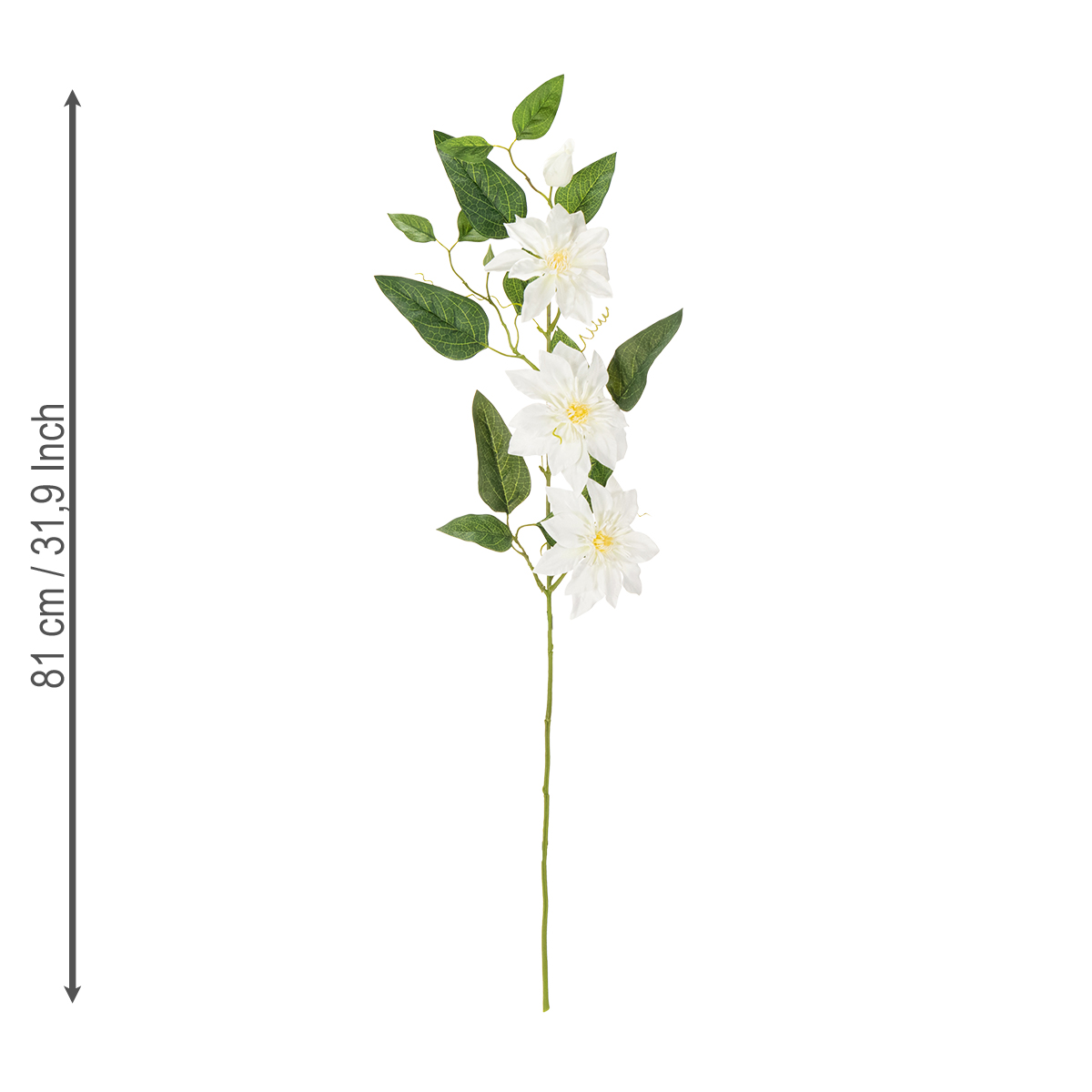 Vaikuttava 81 cm:n pituus antaa sinulle vapauden asetella oksan sekä korkeisiin että mataliin maljakoihin. Lattia- tai pöytämaljakosta tulee välittömästi katseenvangitsija. Klematis-oksa sopii erityisen hyvin kirkkaisiin, ilmaviin huoneisiin tai koriste-elementiksi hääpöytiin, vastaanottoalueille tai tyylikkäisiin toimistoasetelmiin. Haluttaessa sen voi myös yhdistää muihin läpinäkyviin tai valkoisiin koristekukkiin ainutlaatuisen kukka-asetelman luomiseksi. Entäpä jos esimerkiksi lisäisit ripauksen vintage-henkeä asettamalla oksan maalaismaisiin ruukkuihin?