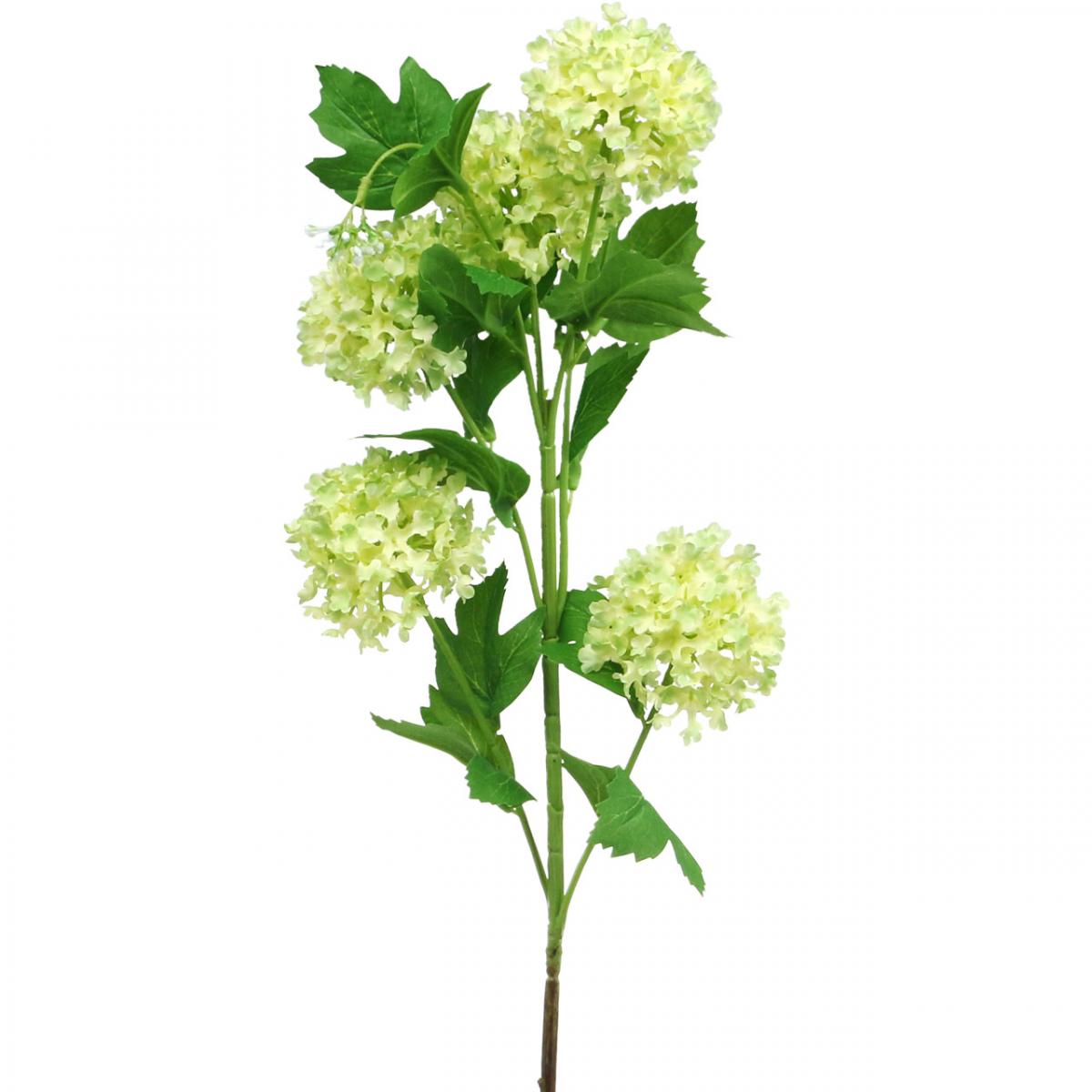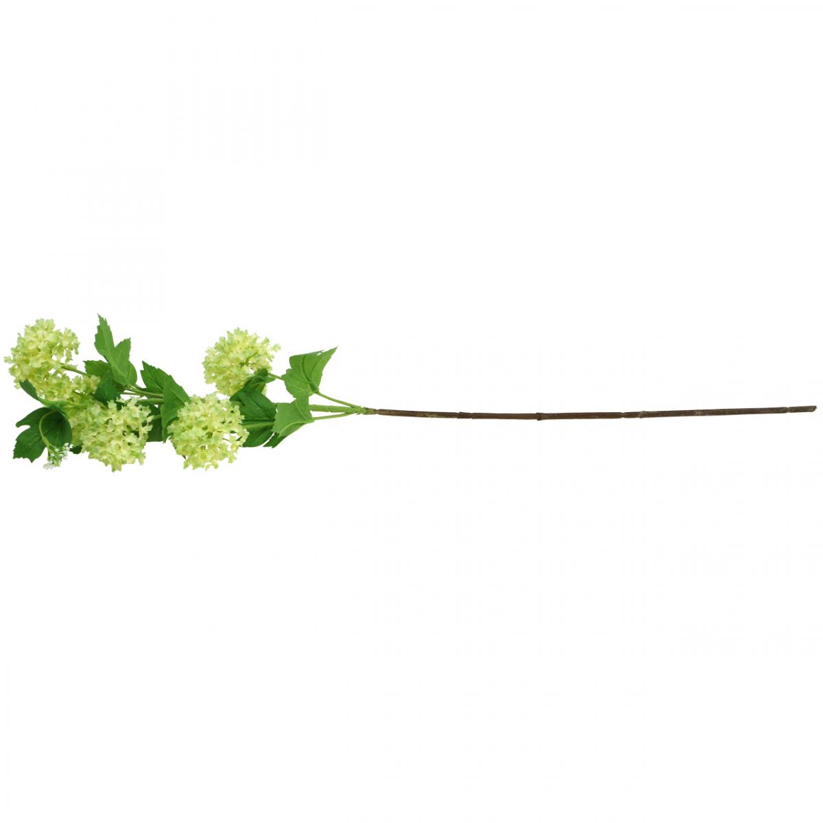 Vihreä lumipallo koostuu pitkästä oksasta, jossa on joustava metalliydin, joka on peitetty viidellä erikokoisella pyöreällä sateenvarjolla, joissa on keltavihreitä kangaskukkia ja kaksi silmuoksaa. - Monet vihreät, tyypillisesti muotoillut virburnumin lehdet täydentävät keinokasvin ilmettä.