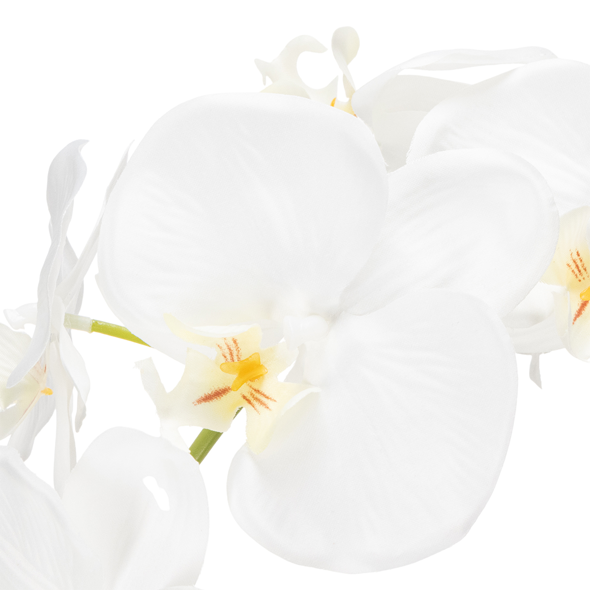 Erityisesti stressaavissa ympäristöissä, kuten toimistopöydällä tai kokoushuoneessa, orkidea pääsee erityisen vaikutuksensa oikeuksiinsa. Sen säteilevän valkoinen väri tuo huoneeseen rauhaa ja harmoniaa, kun taas sen realistinen ulkonäkö tuo luonnon sisätiloihin ilman kastelua tai sijoittelua. Olipa se sitten hyllyllä, käytävällä tai vaikkapa kylpyhuoneessa – tämä orkidea tuo erityistä silausta kaikkialle.