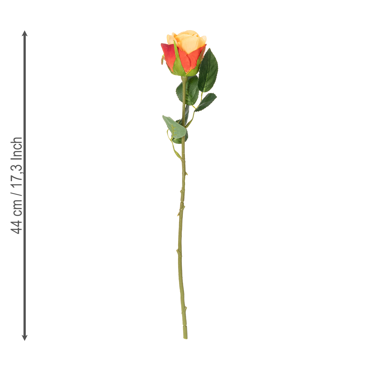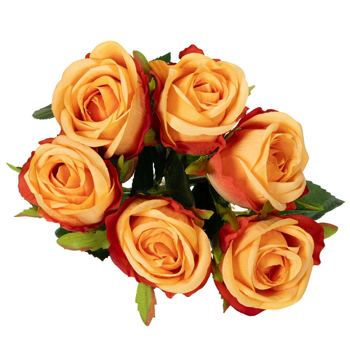Tämä keinotekoinen ruusukimppu kuudella oranssilla kukallaan on todellinen monitoimimies kodinsisustuksen maailmassa. 44 cm korkeana se näyttää erityisen elegantilta korkeissa maljakoissa. Huolellinen käsityötaito korkealaatuisesta polyesteristä ja muovista antaa ruusuille luonnollisen ulkonäön, joka vakuuttaa jopa läheltä katsottuna. Kukkien lämpimän oranssit sävyt tuovat keveyttä ja kirkkautta huoneisiisi, kun taas vihreät lehdet lisäävät ripauksen luontoa. Halusitpa sitten piristää olohuoneesi sisustusta tai etsit tyylikästä lisäystä ruokapöytääsi – tämä kimppu sopii täydellisesti.