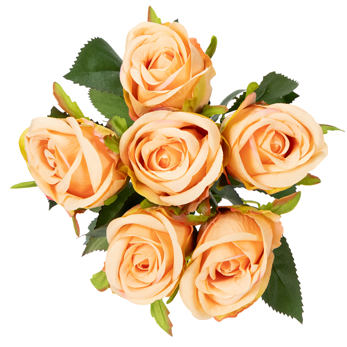 Tämä 44 cm korkea ja 10 cm halkaisijaltaan oleva ruusukimppu sopii täydellisesti keskikokoisiin ja suuriin maljakoihin tai se voidaan sisällyttää luovasti kukka-asetelmaan. Kuusi taidokkaasti valmistettua ruusua herkän vaaleanpunaisilla sävyillään ja luonnonvihreillä lehdillään luovat harmonisen sommitelman, joka huokuu puhdasta eleganssia. Jokainen lehti ja kukinto on huolellisesti työstetty vangitsemaan aitojen kukkien luonnollinen viehätysvoima. Polyesteristä ja muovista valmistettu kimppu on paitsi visuaalisesti miellyttävä, myös erittäin kestävä. Ei nuutuvia lehtiä, ei kuivumista eikä allergioita – selvä etu aitoihin kukkiin verrattuna. Pienellä pölytyksellä se pysyy kauniina useita vuosia, joten se sopii täydellisesti niille, jotka arvostavat kestävää sisustusta. Yhdistä kimppu muihin tekokukkiin mallistostamme tai käytä sitä näyttävänä keskipisteenä – mahdollisuudet ovat käytännössä rajattomat!