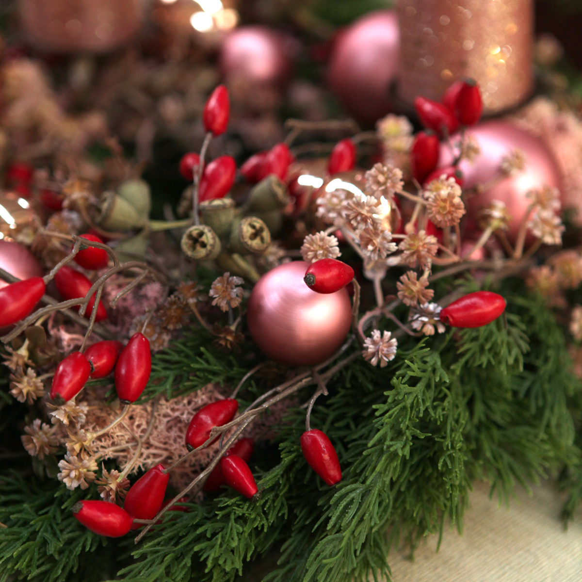Punainen väri symboloi lämpöä ja intohimoa, mikä sopii täydellisesti syksyn viihtyisään tunnelmaan. Ruusunmarjat edustavat myös teemoja, kuten uudistumista ja hedelmällisyyttä. Punaiset yksityiskohdat antavat huoneelle eloisan ja positiivisen auran. Erityisesti pimeämpinä vuodenaikoina punainen seppele tuo eloisan ja energisen säväyksen kotiisi.