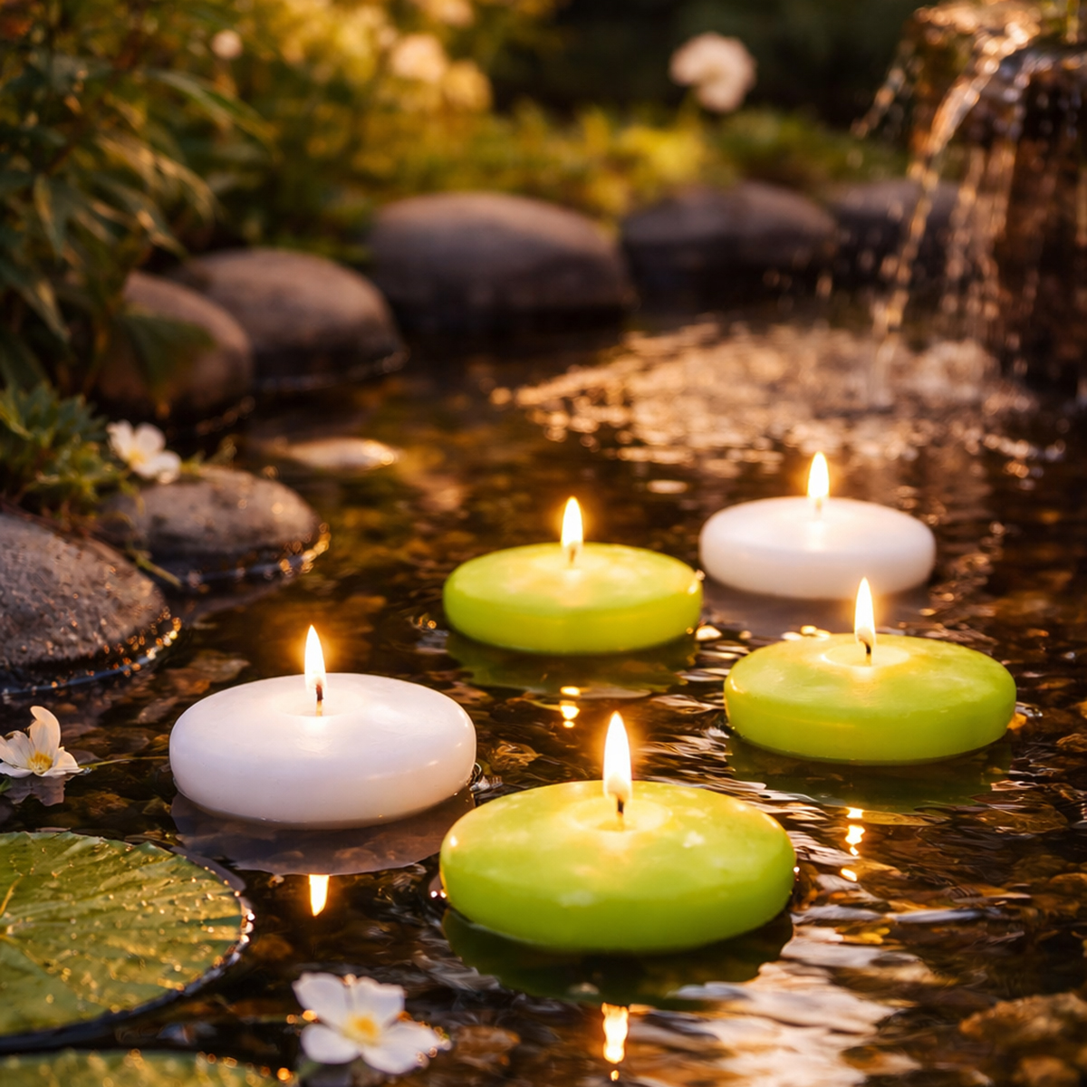 Lumpeiden, ruokojen ja muiden vesikasvien keskellä kevyesti ajelehtivien kynttilöiden ansiosta puutarhasi pienestä lammikosta tulee maaginen rauhan keidas. Vaihtoehtoisesti voit asettaa kynttilät suureen, vedellä täytettyyn sinkkiastiaan tai peltisämpäriin – pieni vaihtoehto lammelle, joka on kaunis koriste parvekkeille ja terasseille. Voit jopa käyttää näitä epätavallisia teekynttilöitä pöytäkoristeina. Täytä vain matala kulho, lasimaljakko tai suurempi lyhty vedellä ja anna kelluvien kynttilöiden ajelehtia sen päällä. Upea vaihtoehto klassiselle kynttilänjalalle, jota voit personoida lisää kukkaterälehdillä, kivillä ja värikkäällä koristehiekalla.
