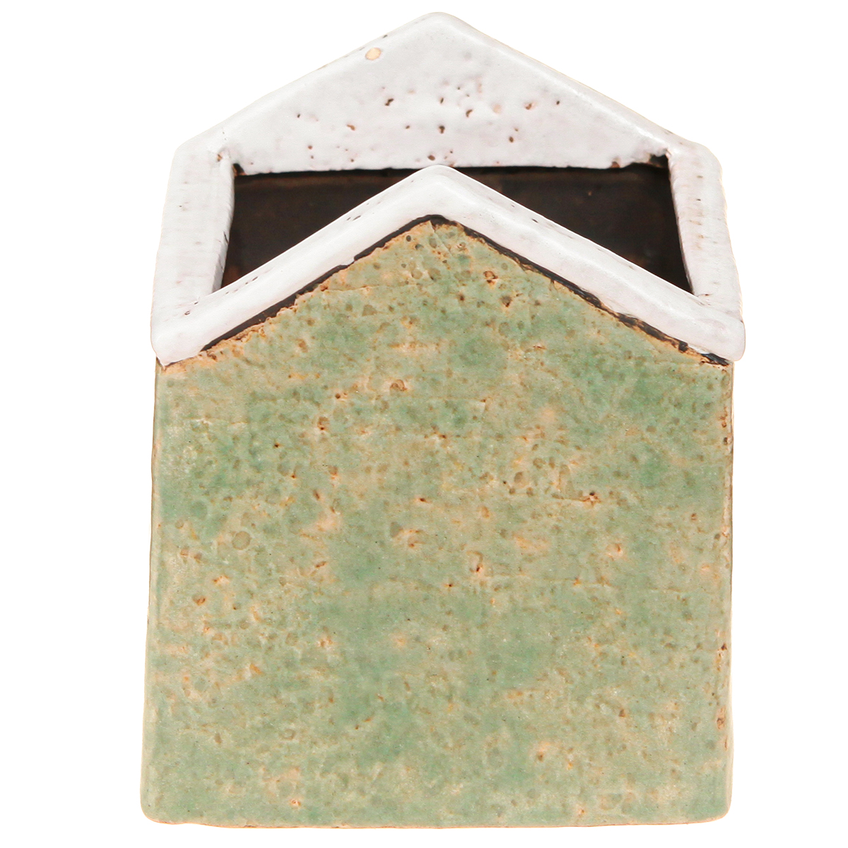 Tyylikäs adventtikoristeena: mintunvihreä ja valkoinen talon muotoinen keraaminen ruukku