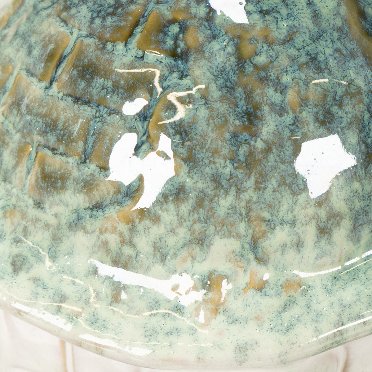 Tämä rakkaudella valmistettu keraaminen kilpikonna ei ainoastaan tuo raikasta ilmettä kotiisi, vaan myös tekee vaikutuksen korkealaatuisella työllään ja ainutlaatuisella ulkonäöllään. Kuori hohtaa pehmeän vihreänä luonnollisella liukuvärillä, kun taas vartalo on elegantin kermanvärinen. Esteettiset yksityiskohdat antavat raikkaan ja harmonisen ilmeen mihin tahansa ympäristöön. Hahmo sopii erinomaisesti olohuoneen hyllyn tai puutarhapöydän koristamiseen. Se näyttää myös lumoavalta parvekkeella tai yhdistettynä kasviasetelmiin eteisessä. Ajattoman muotoilunsa ansiosta se täydentää täydellisesti merellistä, modernia tai maalaistyyliä. Keraaminen kilpikonna ei ole pakkasenkestävä, mutta se sopii täydellisesti käytettäväksi talvipuutarhassa tai sisätiloissa. Esittele kilpikonnaa värikoordinoiduilla ruukuilla, maljakoilla tai muilla koristeellisilla hahmoilla – tulet olemaan iloinen tuloksesta!
