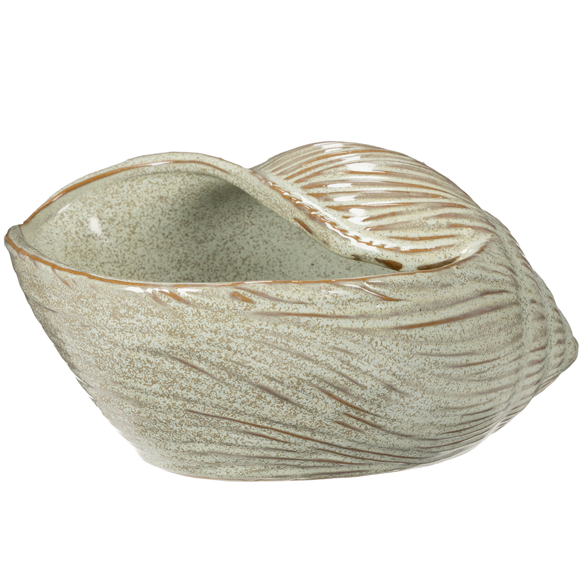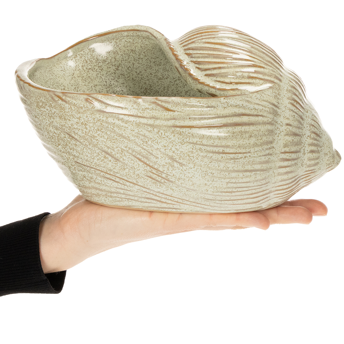 Tämän keraamisen kulhon ainutlaatuinen muoto tuo mieleen simpukankuoren pehmeät kaaret. Hienovarainen vihreän ja herkän beigenruskean sävyjen vuorovaikutus antaa sille ajattoman kauneuden. Tämän muotoilun katseleminen tuo mieleen pitkiä kävelyretkiä rannalla – se tuo rauhallisen, luonnosta inspiroituneen tunnelman mihin tahansa huoneeseen. Kulho sopii täydellisesti avainten säilyttämiseen eteisessä, pienten korujen esillepanoon peilipöydällä tai jopa istutusastiaksi tuomaan ripauksen eleganssia pienillä mehikasveilla.