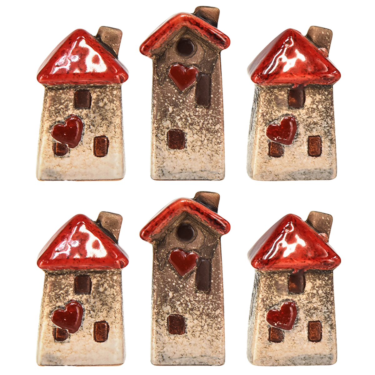 Keraaminen talo punaisella kattoikkunalla ja sydämellä - 6 cm - Idyllinen sisustus kotiin ja puutarhaan - 6 kpl