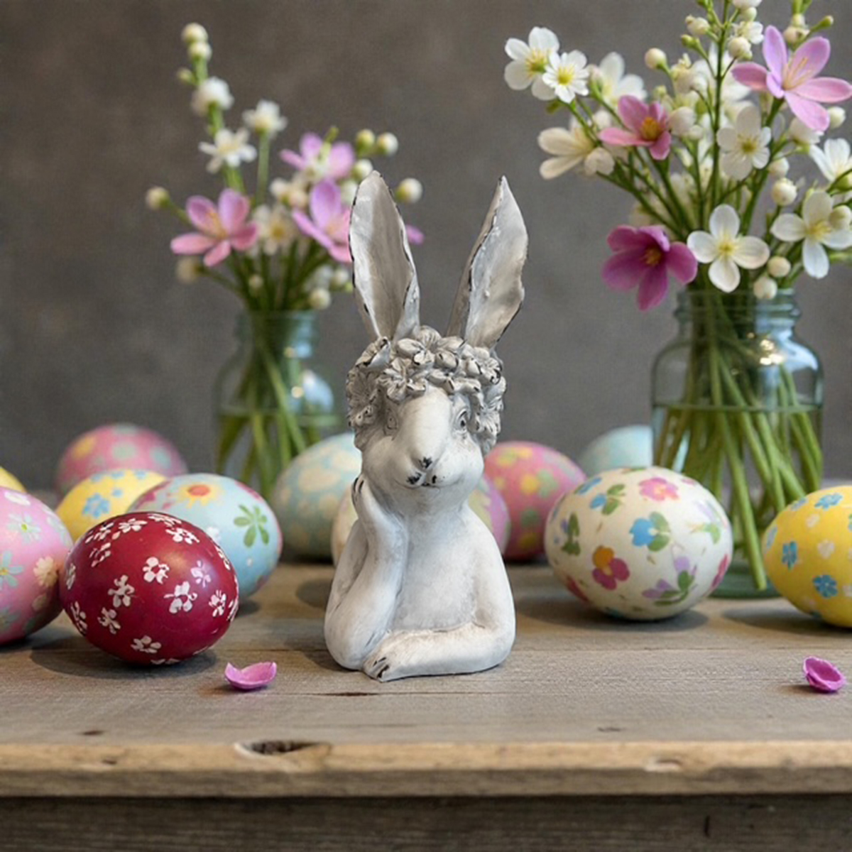 Kevät on täällä, ja sen mukana tulee kaipuu herkille koristeille, jotka piristävät kotiasi. Etsitkö vielä täydellistä kappaletta korostamaan kattaustasi tai lisäämään juhlavaa silausta eteiseen? Elegantin harmaa koristeellinen kani, jota koristaa ihastuttava kukkaseppele, ilmentää kevään raikkautta ja keveyttä paremmin kuin mikään muu asuste. Monimutkaisella muotoilullaan ja 34 cm korkeudellaan se on todellinen katseenvangitsija, joka lisää vaivattomasti ripauksen tyylikästä tunnelmaa olohuoneeseesi, juhlapöytääsi tai näyteikkunaasi.
