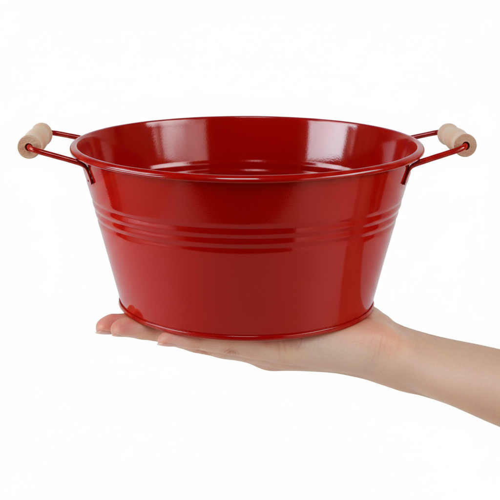 Tämä kukkakulho loistaa kauneimman punaisena. Klassista muotoa täydentävät kahvat aidoilla puisilla kahvoilla. Metallikoristelu näyttää harmoniselta ja nostalgiselta.