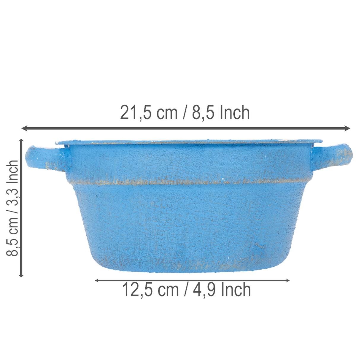 Koristekulho on valmistettu ohuesta metallista ja on siksi erittäin kevyt. Koristeruukun sisäpuoli on valkoinen, ulkopuolelta metallikoristelu loistaa kauneimman taivaansinisenä. Karhennetun pinnan ja harmaiden aksenttien ansiosta istutuskone näyttää aidon vanhalta. Helmi ja kaksi pientä kahvaa mahdollistavat koristekulhon langallisen tai koristelun tarvittaessa juuttinauhalla.
