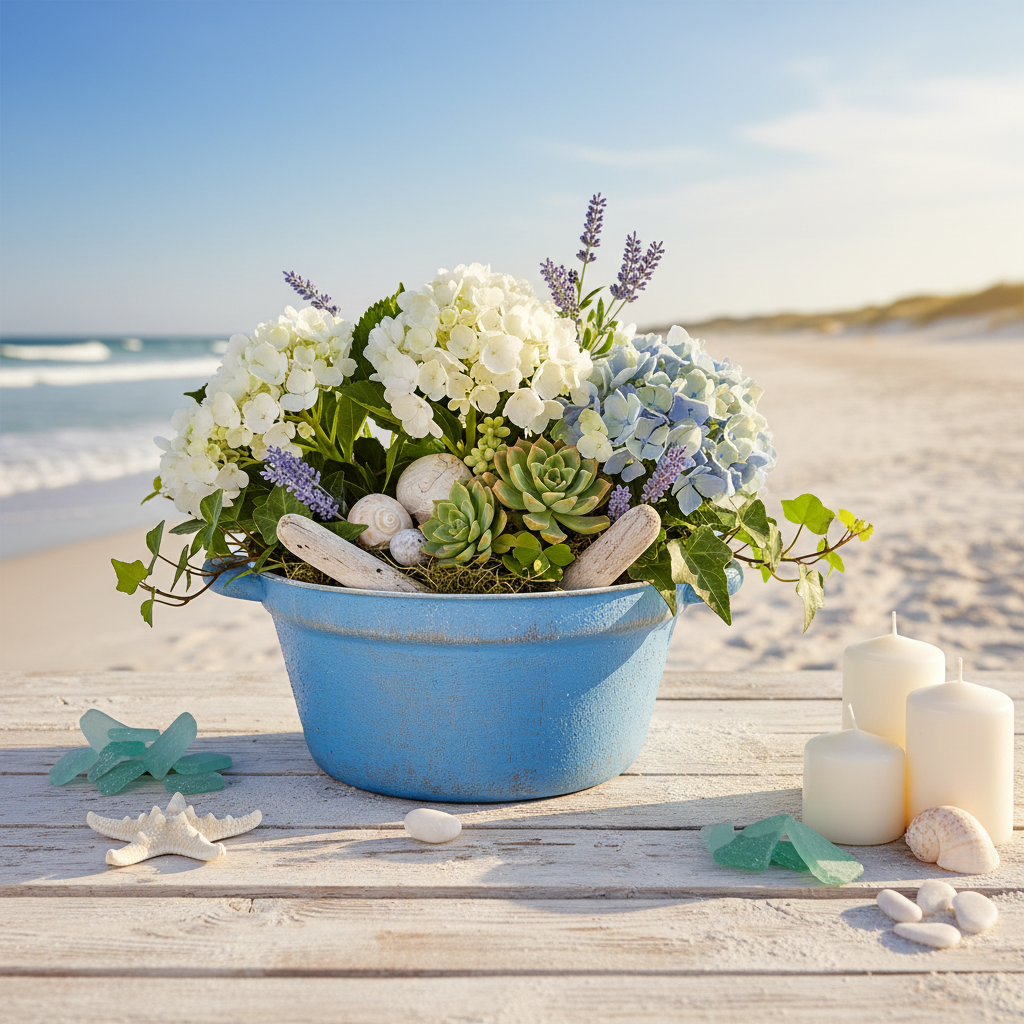 Metallikoristelu näyttää kauniilta myös koristekivien tai hiekan ja mehikasvien kanssa. Värimaailmansa ansiosta istutuskone sopii täydellisesti mihin tahansa merelliseen sisustukseen. Koristele kulho hiekalla, kuivatuilla kukilla, kuorilla ja ajopuulla. Näin metallikätköpotista tulee harmoninen pöytäkoristelu.