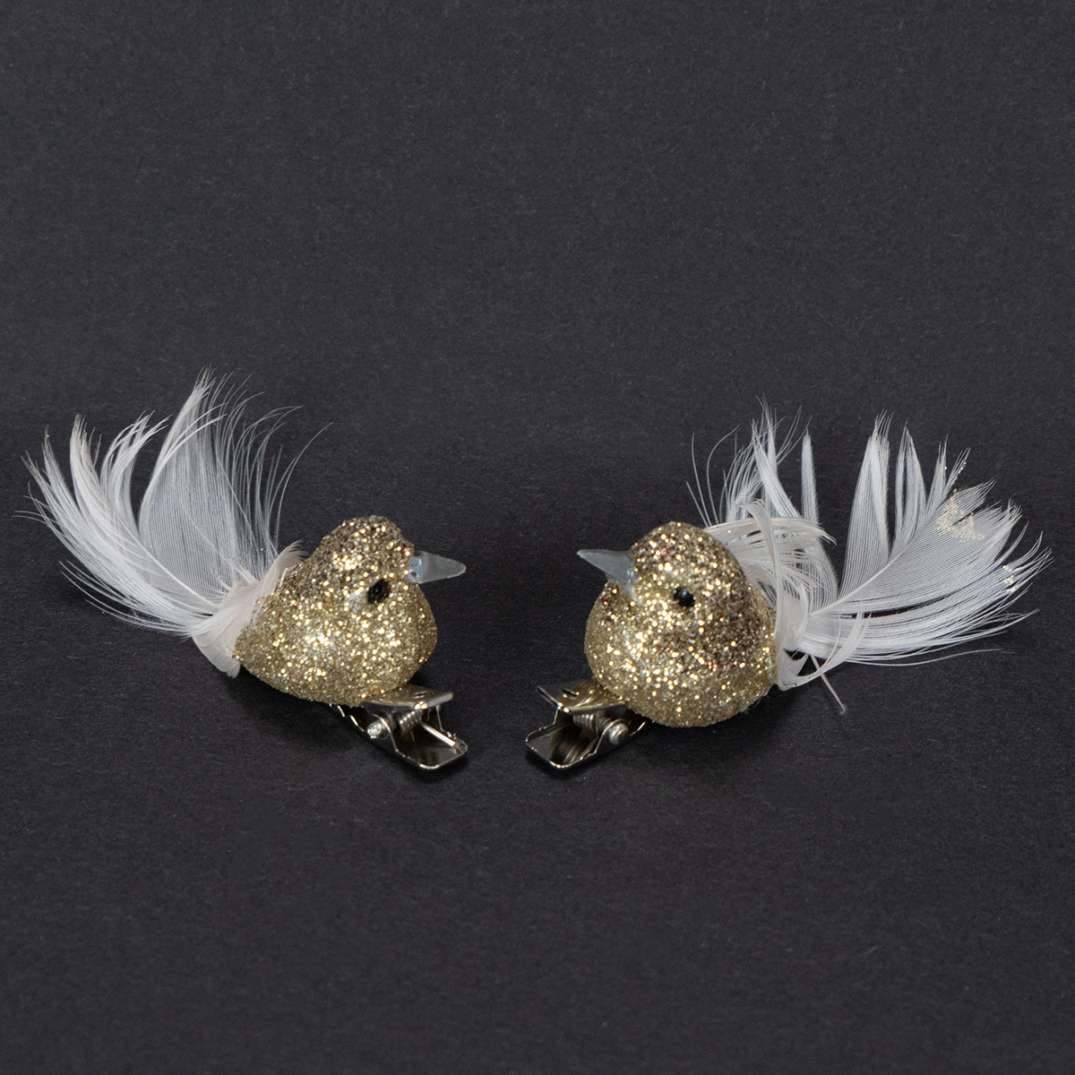 Piristä joulukuusikoristeitasi näillä kimaltelevilla kultaklipsikoristelintuilla tai käytä niitä pareittain koristekyyhkysparina alkuperäiseen hääkoristeeseen!
