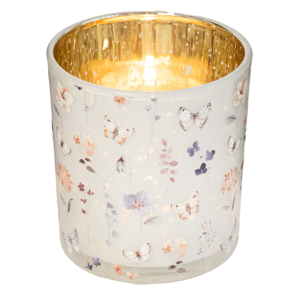 Tämä kynttilänjalka on todellinen katseenvangitsija. 8 cm korkea ja 7 cm halkaisijaltaan oleva se on juuri sopivan kokoinen levittämään pehmeää valoa olematta liian voimakas. Lasin herkkä perhosaihe yhdistettynä sisäiseen hopeiseen heijastavaan pintaan luo taianomaisen valon ja varjon vuorovaikutuksen, kun kynttilä sytytetään sisällä. Se lisää ripauksen eleganssia sekä sisä- että ulkotiloihin.