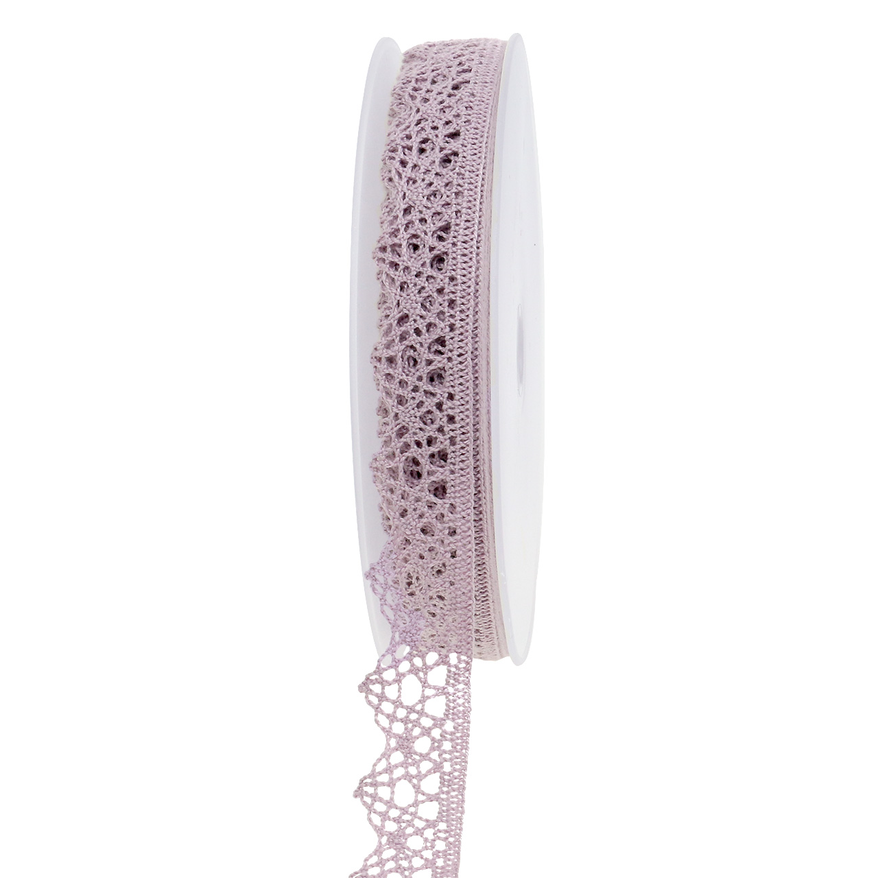 100 aumwollesta valmistettu lilanvärinen pitsikoristenauha toimitetaan sinulle kätevällä, helposti säilytettävällä muovikelalla, johon se kiinnitetään ohuella neulalla. Leveydeltään se on noin 22 millimetriä ja pituudeltaan noin 20 metriä.