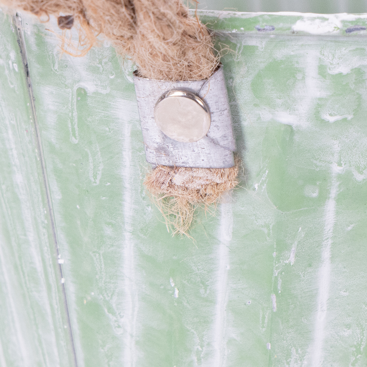 Ruukussa on juuttinarusta valmistetut kahvat ja se on kalkittu. Istutusmalja on myös koristeltu kauttaaltaan kohokuvioidulla, yhtenäisellä pystysuorien raitojen kuviolla. Ruukkujen kalkittu pinta luo kauniin kontrastin metalliastioiden pastellinpunaisen, vihreän ja keltaisen pohjasävyille, mikä korostaa metallikoristeen kuviota entisestään!