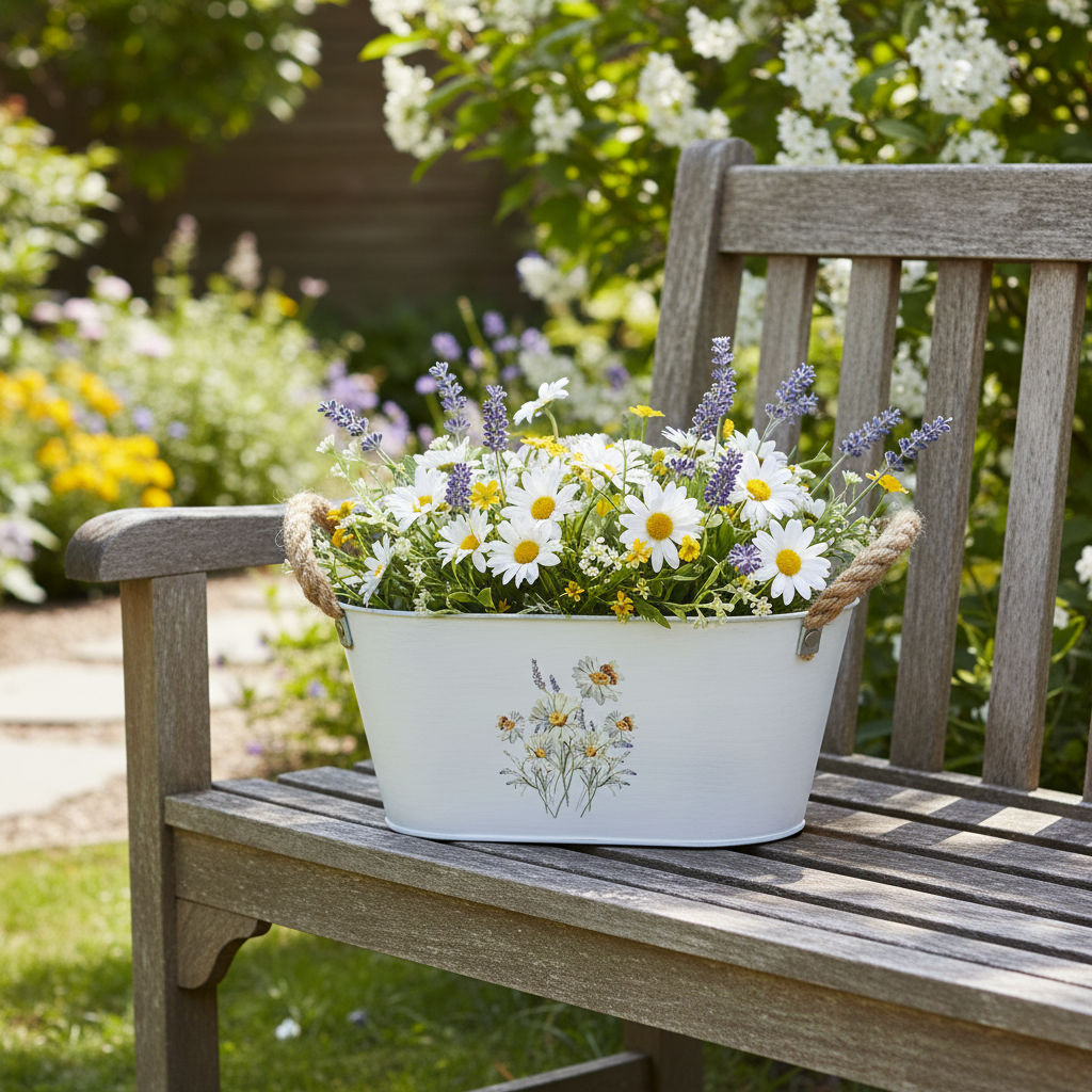 Soikeassa metallisessa koristekulhossa kukkivat valkoiset koiranputket ja violetti laventeli. Mehiläiset vierailevat kukkien luona. Kaksi juuttikahvaa täydentävät taidokkaasti valkoisen metallikulhon luonnollista kuvaa.