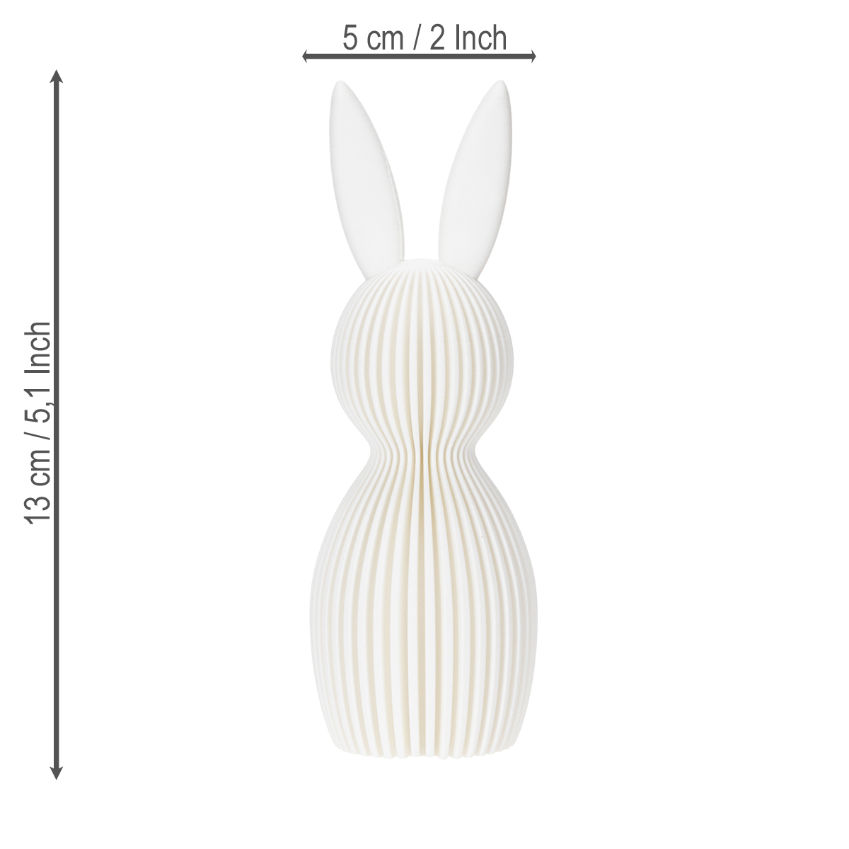 Koe elegantti muotoilu parhaimmillaan! Tämä koristeellinen pupuhahmo modernilla, taitellulla ulkonäöllään on todellinen kohokohta modernin ja minimalistisen sisustuksen ystäville. Kätevän 13 cm korkea ja 5 cm halkaisijaltaan oleva pupu integroituu vaivattomasti mihin tahansa ympäristöön olematta kuitenkaan häiritsevä. Valkoinen väri sopii kauniisti yhteen erilaisten sisustustyylien kanssa – skandinaavisesta ja minimalistisesta urbaaniin moderniin. Aseta se vain hyllylle tai pöydälle, ja pupu lisää tyylikkään silauksen huoneisiisi.