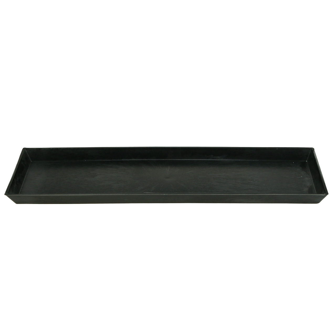 Antrasiitin värinen koristetarjotin on valmistettu kokonaan muovista. Sisämitat ovat noin 40 x 12 senttimetriä ja ulkomitat noin 43,5 x 12,5 senttimetriä. Korkeus on noin 2 senttimetriä.
