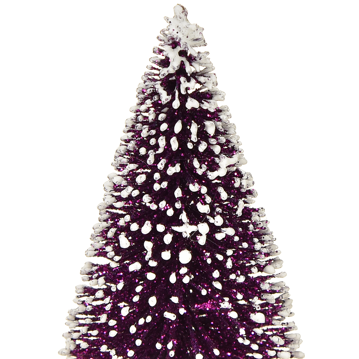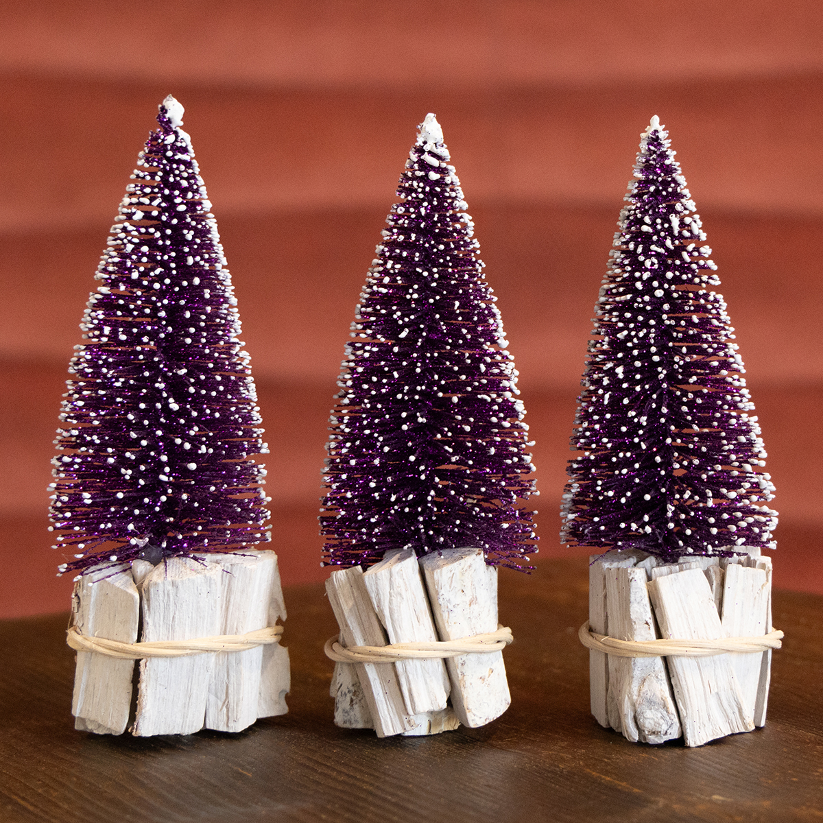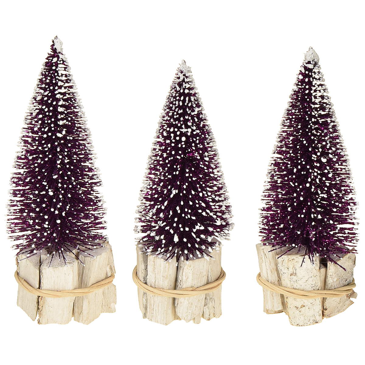 Koristeellinen violetti joulukuusi, jossa lumikärki, maalaismaisella puujalustalla 15 cm, 3 kpl.