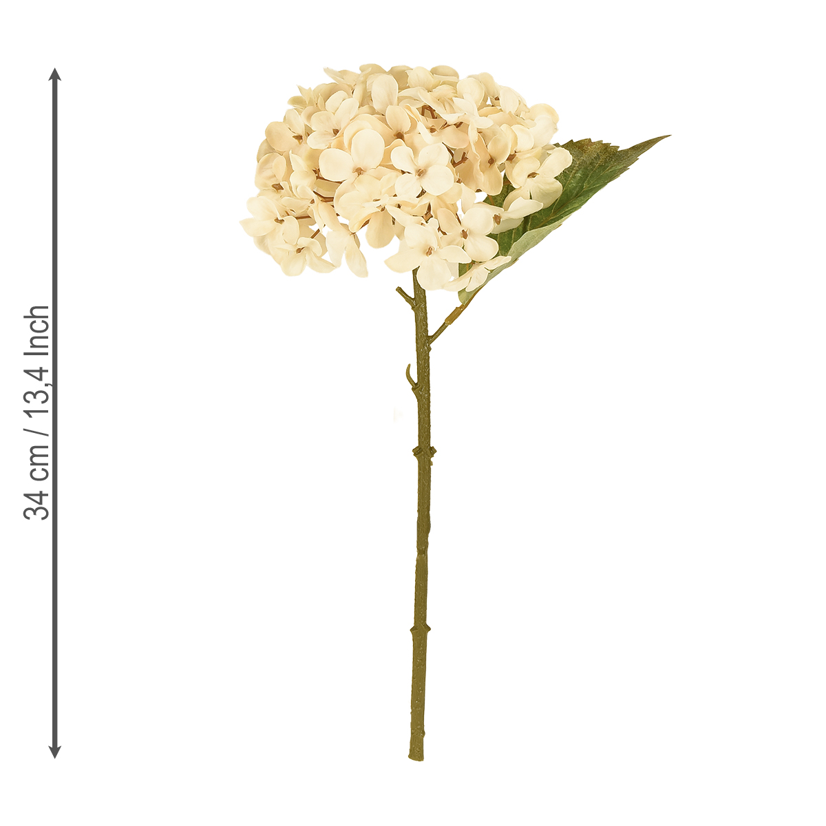 Nämä kermanväriset keinotekoiset hortensiat ovat täydellinen kukkakoriste kesään ja syksyyn! Noin 34 cm korkeat ja elegantin kermanväriset, poikkeuksellisen realistiset silkkikukat sulautuvat saumattomasti minkä tahansa huoneen sisustukseen. Tämä keinotekoinen hortensian (latinaksi: Hydrangea ) kopio heijastaa hieman kuivuneen kukan kauneutta loppukesästä ja antaa kotiisi romanttisen, nostalgisen ilmeen. Kukat on valmistettu korkealaatuisesta silkistä ja ne istuvat tukevalla mutta joustavalla varrella, jonka metallinen ydin voidaan muotoilla mieleiseksesi. Kermanväriset kukkapäät vihreine lehtineen näyttävät petollisen aidoilta ja ihastuttavat varmasti shabby chic -tyylisten kodinsisusteiden ystäviä. Nämä silkkihortensiat sopivat täydellisesti hillityihin pöytäasetelmiin, kestäviin syyskoristeisiin ja inspiroiviin tee-se-itse-projekteihin.