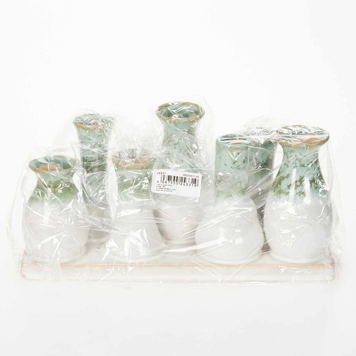 Tämä seitsemän pienen koristeellisen keraamisen maljakon sarja värikoordinoidulla tarjottimella tulee nopeasti sisustuksesi kohokohta. Harmoniset vihreän ja valkoisen sävyt herättävät skandinaavisen muotoilun luonnollisuuden ja täydentävät täydellisesti minimalistista tai rustiikkista tyyliä. Maljakot ovat muodoltaan erilaisia, mikä lisää kermanvärisen sävyn visuaalista mielenkiintoa. Olipa ne sitten ryhmänä tai yksittäin järjestettyinä, tämä sarja tarjoaa lukemattomia suunnittelumahdollisuuksia.