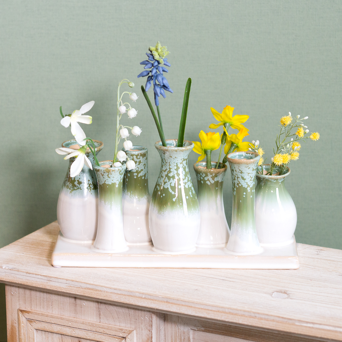 - 7 koristeellisen keraamisen maljakon setti tukevalla tarjottimella